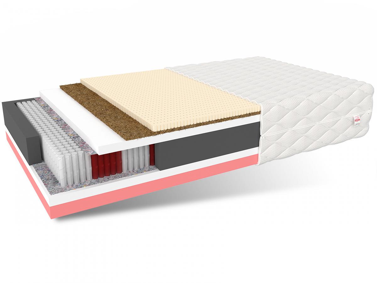 Specifikace: tvrdost: H4 tvrdá H3 středně tvrdý tloušťka: 22 cm Složení: Perforovaný latex: 2 cm kokosová vložka: 1 cm polyuretanová pěna T25: 2 cm obal: 1 cm výška pružiny: 12 cm termoplastická pěna VISCO: 2 cm polyuretanová pěna T25: 2 cm