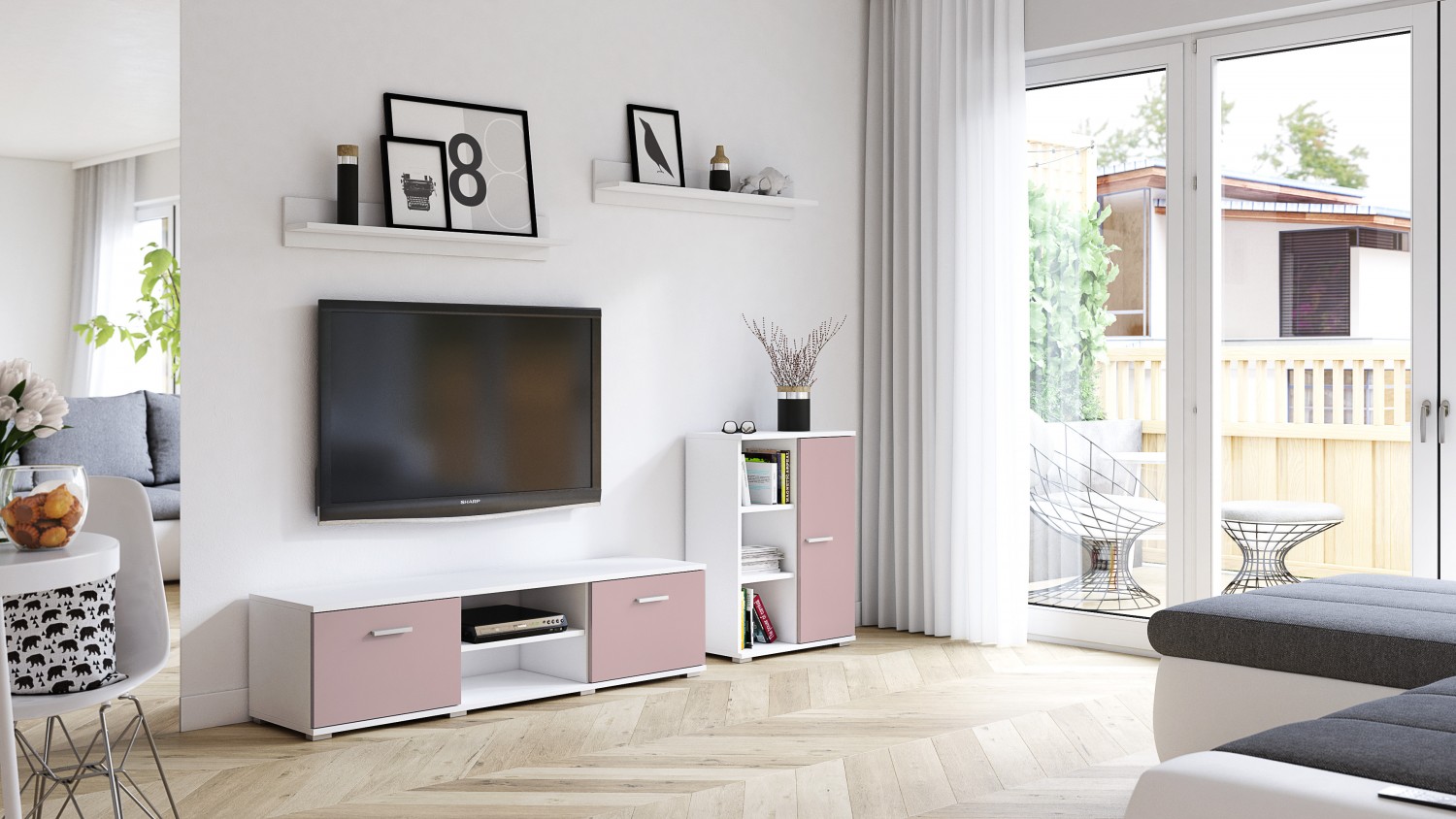 Obývací stěna Rio Barva korpusu: Bílá, Lišta: Šedá, Barva dvířek: Dub - sonoma
