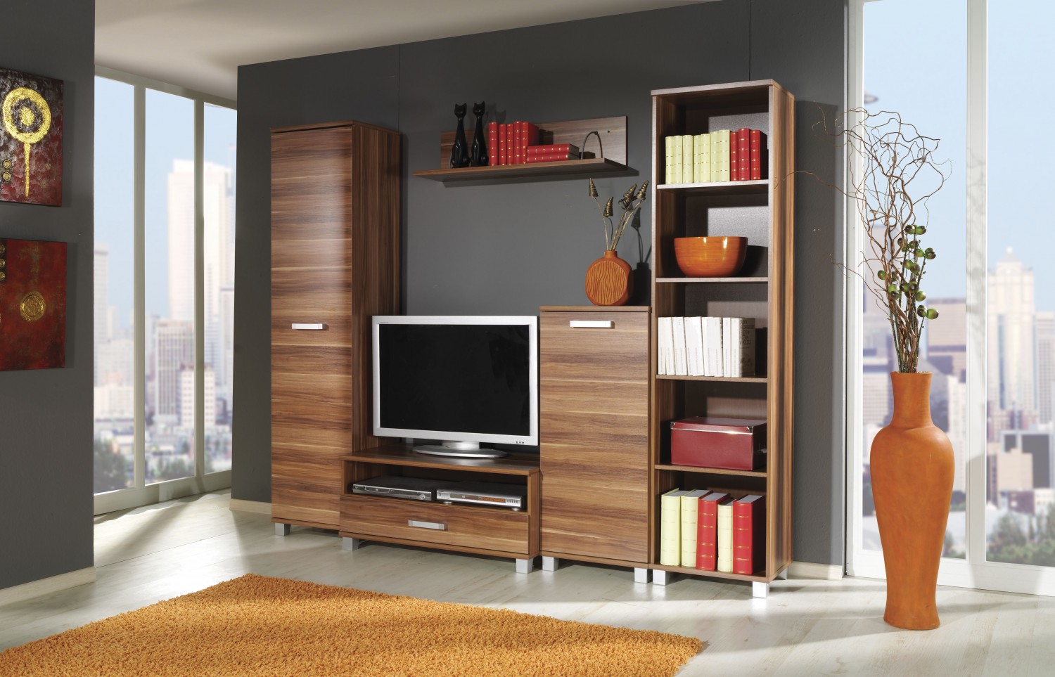 Sada obsahuje: Regál M1: výška: 203 cm / šířka: 50 cm / hloubka: 40 cm Komoda M5: výška: 115 cm / šířka: 50 cm / hloubka: 40 cm Komoda M7: výška: 45 cm / šířka: 100 cm / hloubka: 51 cm Police M8: výška: 25 cm / šířka: 100 cm / hloubka: 27 cm Regál M12: výška: 203 cm / šířka: 50 cm / hloubka: 40 cm Barva: tělo: švestka wallis / přední část: švestka wallis (na fotografii) tělo: kaštan wenge / přední část: kaštan wenge tělo: bílé / přední: bílé tělo: sonoma / vpředu: sonoma Systém Maximus je mimořádně efektivní a stylová sada nábytku s velmi pevnou strukturou, která jedinečným způsobem naplní váš interiér. Díky prvkům tohoto systému bude váš byt díky modernímu designu a barvám čelních stran skutečně jedinečný.Nábytek z laminované desky, hrany zajištěné ABS hranou. Tloušťka těla - 22 mm, čela - 16 mm.