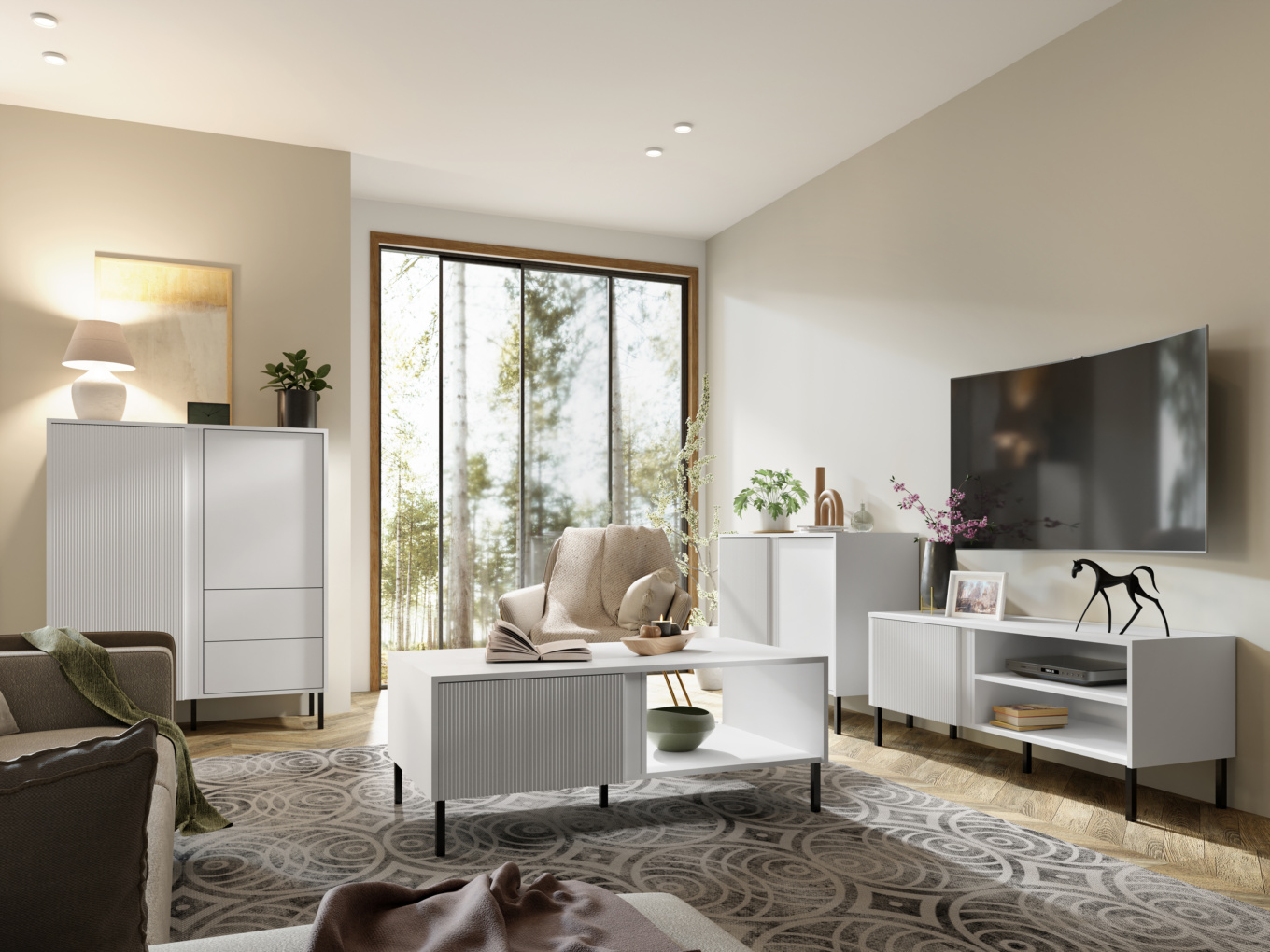 MIA – bílá v moderním provedení Nábytková sestava MIA v kompletně bílém provedení je ztělesněním svěžesti a lehkosti. Hladké, matné povrchy v jednotné bílé barvě dodávají interiéru prostornost a eleganci a zároveň zůstávají světlé a harmonické. Minimalismus s elegancí Bílá kolekce MIA je ideální volbou pro milovníky jednoduchosti a čistých forem. Díky modernímu designu a jemným detailům se nábytek hodí jak ke skandinávskému stylu, tak k modernímu minimalismu. Černé kovové nohy decentně kontrastují s bílou a dodávají celku lehce industriální nádech. Praktičnost a estetika Funkční uspořádání skříněk, zásuvek a polic poskytuje pohodlné úložné prostory a bílá barva se snadno sladí s jakýmkoli uspořádáním. Nábytek MIA rozjasní prostor a dodá mu moderní, uspořádaný vzhled. Zvolte bílou kolekci MIA – pro interiéry, které chtějí dýchat prostorem a světlem. Elementy sestavy (šířka/výška/hloubka) Komoda MIA 2D2S (100/122/41 cm) Komoda MIA 2D (100/80/41 cm) RTV stolek MIA 120 (120/50/41 cm) Konferenční stolek MIA (110/45/65 cm) Rozměrová tolerance +/- 3 cm.