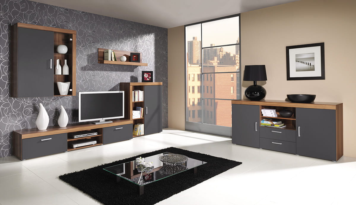 Komponenty sady (šířka / výška / hloubka): SAMBA 4 závěsná skříňka (90/111/35) SAMBA 8 RTV (200/39/45) SAMBA 7 police (110/30/22) Skříň SAMBA 3 (90/114/35) Komoda SAMBA 5 (164/80/45)