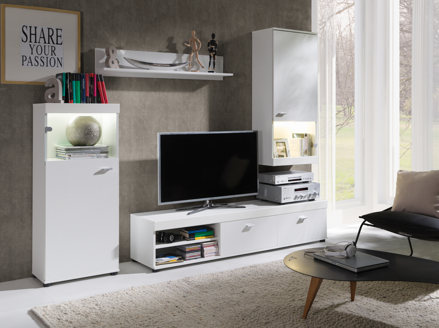 SESTAVA SE SKLÁDA Z (šířka/výška/hloubka) cm: Stojací skříň - 50/118/30 cm RTV - 165/36/40 cm Police - 110/20/17 cm Závěsná skříňka - 50/115/30 cm