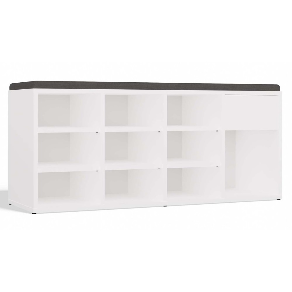 Praktická skříňka do předsíně se sezením Botník TALLIN je funkčním a estetickým řešením do každé předsíně, které kombinuje pohodlí sezení s dostatkem úložného prostoru. Bílý tvar s lehkým, moderním vzhledem je obohacen o čalouněný sedák, který zajišťuje pohodlí při obouvání. Nábytek je vybaven až 9 otevřenými přihrádkami na boty, zásuvkou na drobnosti a vysokou přihrádkou, do které snadno uložíte vyšší boty nebo doplňky. PROVEDENÍ 9 prostorných přihrádek - ideální na boty, doplňky a organizaci prostoru 1 praktická zásuvka - ideální na klíče, rukavice nebo přípravky na péči o boty 1 vyšší boční přihrádka - ideální na boty, deštníky nebo tašky Čalouněný sedák - měkký a pohodlný Univerzální, bílá barva - hodí se do moderních i klasických interiérů Stabilní konstrukce - vyrobeno z 16 mm silné laminované desky CELKOVÉ ROZMĚRY Šířka - 110 cm Výška se sedákem - 49 cm Hloubka - 35 cm VNITŘNÍ ROZMĚRY Výška přihrádek na boty - 13,2 cm Šířka přihrádek - 25,1 cm Výška horní boční přihrádky - 28 cm Šířka horní boční přihrádky - 26,5 cm ROZMĚRY ZÁSUVKY Šířka přední části - 26 cm Výška přední části - 14,6 cm Vnitřní šířka - 20,8 cm Vnitřní hloubka - 40,9 cm Vnitřní výška - 8 cm Rozměrová tolerance +/- 3 cm.