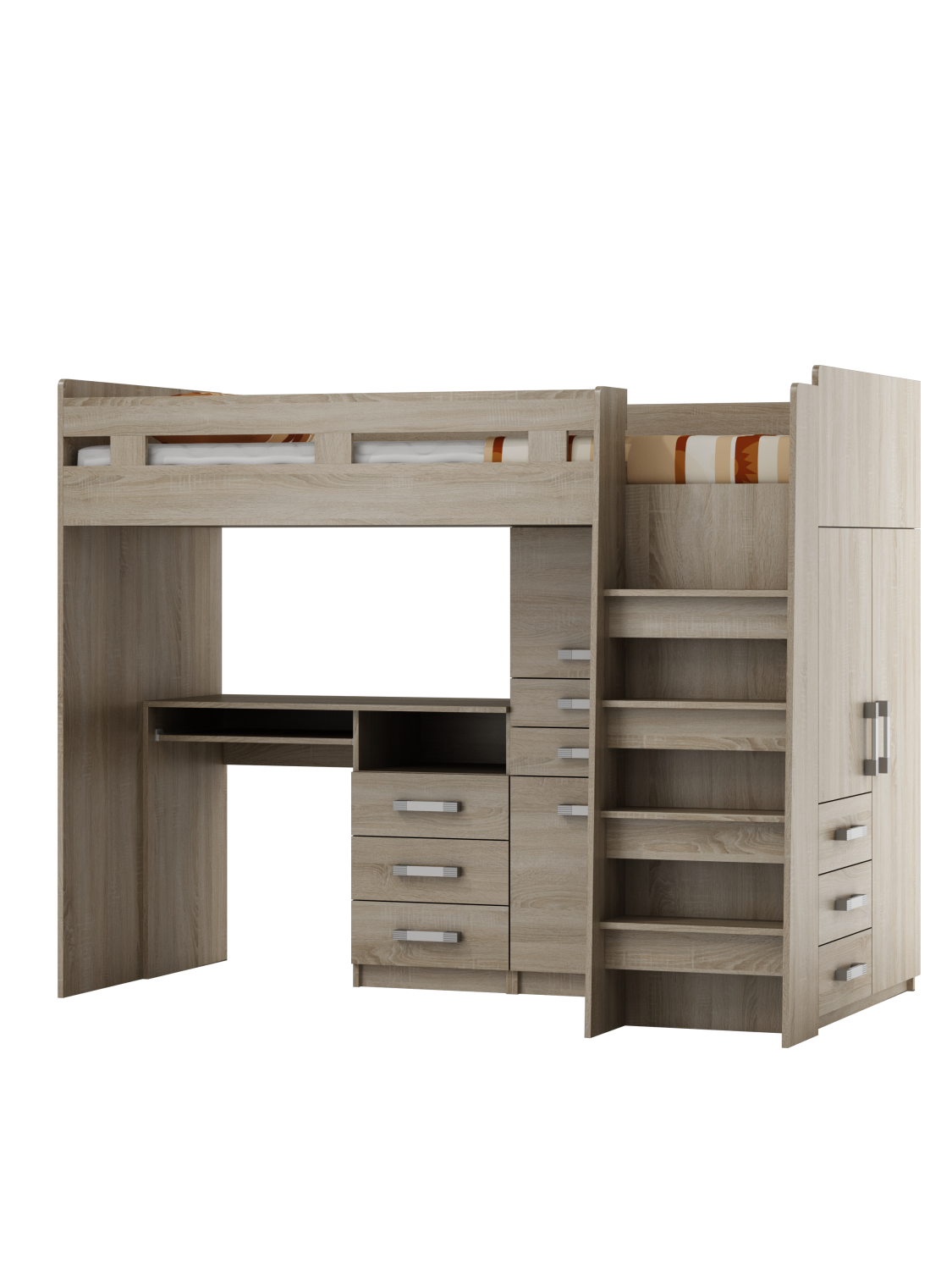 Poschoďová postel s šatní skříní, praktickou knihovnou a psacím stolem šířka 93,8 cm + 25 žebřík cm výška 160 cm hloubka 204 cm