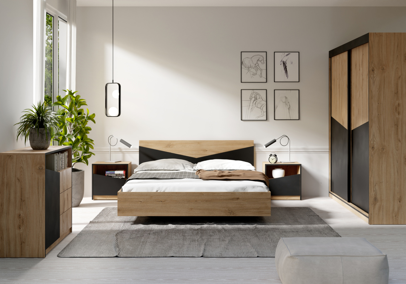 Pokojová sestava ASTON - vyberte si kvalitu a pohodlí Ložnice je jedinečné místo, kde pohodlí a praktičnost hrají zvláštní roli. Se správným nábytkem do ložnice si můžete vytvořit prostor, který splňuje individuální požadavky z hlediska funkčnosti a estetiky. Vyplatí se vybrat řešení, která splňují nejvyšší standardy kvality. Ložnicová sestava ASTON v barvě věčného dubu/černé splní očekávání i těch nejnáročnějších uživatelů. Trvanlivost po mnoho let a funkčnost jsou jejími hlavními výhodami. Krásná ložnice v moderním stylu Vytvoření atmosféry v ložnici, která je příznivá k odpočinku a nabádá ke klidnému spánku, je z velké části zásluhou jednotlivých prvků vybavení. Ložnicový nábytek ASTON je klasikou v moderním provedení - perfektně se hodí nejen do minimalistických interiérů. Teplá barva přírodního dřeva vnáší pocit harmonie, který pomáhá uklidnit mysl. Celá sestava vypadá mimořádně elegantně a vkusně a má uklidňující účinek na smysly. Postel je dodávána bez matrace. Elementy sestavy (šířka/výška/hloubka) Šatní skříň ASTON 150 (150/215/65 cm) Komoda ASTON 1D3S PRAVÁ (100/91/41 cm) Noční stolek ASTON LEVÝ (50/50/36 cm) Noční stolek ASTON PRAVÝ (50/50/36 cm) Postel ASTON 165x205 (165/82/206 cm) Rozměrová tolerance +/- 3 cm.