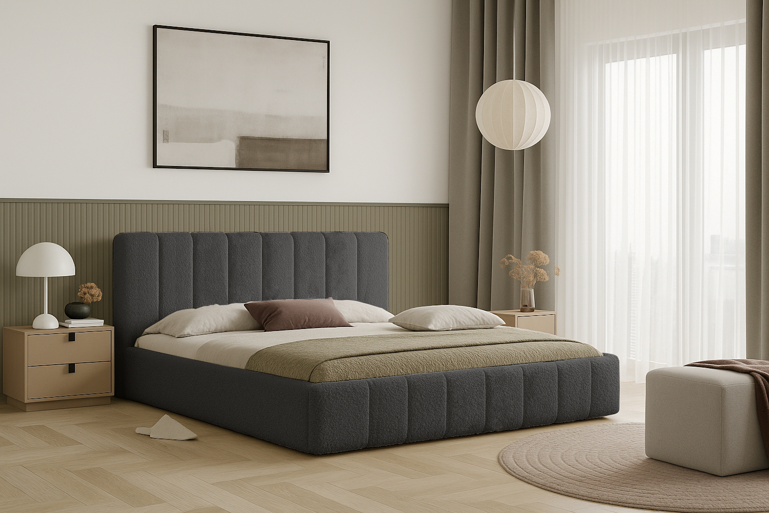 Postel RIMINI 140x200 s úložným prostorem - bouclé - grafitová Postel RIMINI není jen místem k odpočinku, ale skutečnou oázou klidu, kde jsou detaily dokonale propracované a vytvářejí jedinečnou atmosféru ložnice. Naše elegantní čelo postele nejen dodává posteli charakter, ale také poskytuje ergonomickou oporu vašemu tělu. Postel RIMINI, vyrobená z nejkvalitnějších materiálů a pečlivě zpracovaná, se perfektně hodí do různých stylů ložnic a dodává jim jedinečné kouzlo. Pevný dřevěný rám vyztužený kovovými prvky, zajišťuje nejen stabilitu, ale i trvanlivost nábytku po mnoho let. Dostupnost v různých velikostech a barvách umožňuje, aby se postel RIMINI dokonale přizpůsobila individuálním preferencím každého zákazníka a stala se nenahraditelným prvkem každé ložnice. Bez ohledu na interiérový design, postel RIMINI zaručuje nezapomenutelný spánkový komfort a luxusní design, který zdůrazní jedinečnost vašeho domova. Pořízením naší postele RIMINI investujete nejen do vlastního pohodlí, ale také do estetiky a elegance vašeho obytného prostoru. Dopřejte si chvilku luxusu výběrem naší jedinečné postele RIMINI, která z vašeho spánku udělá nezapomenutelný zážitek plný relaxace a regenerace. Objevte rozdíl, který dokáže vytvořit vysoce kvalitní postel RIMINI, a ponořte se do zážitku naprostého pohodlí a klidu. Vytvořte si vlastní ráj v ložnici a užijte si každý okamžik nádherného spánku obklopeni luxusem a rafinovaným designem. PROVEDENÍ Postel je vybavena dřevěným zvedacím rámem, rám matrace se skládá z 32 pružinových lamel, které mají pozitivní vliv na pohodlí spánku. Rám se zvedá pomocí kovového pružinového mechanismu. Konstrukce je vyrobena z vysoce kvalitní dřevotřísky a dřevěných prvků, což zaručuje trvanlivost postele. Pro výrobu konstrukce našeho nábytku používáme pouze osvědčené polotovary od spolehlivých zdrojů. Kvalitní zpracování, významná část výroby probíhá na přesných CNC strojích. Prošívané čelo postele s vysokopevnostními nitěmi. Uspořádání prošívaného vzoru se může lišit v závislosti na šířce čela postele. Po zvednutí rámu postele je prostor rozdělen přepážkou. Zadní část přepážky nemá spodní desku, pouze přední část má nádobu na ložní prádlo. Maximální nosnost rámu je 400 kg Cena postele nezahrnuje matraci. Produkt pro svépomocnou montáž, jasný návod k montáži a příslušenství součástí sady, zaručují rychlou a bezproblémovou montáž ROZMĚRY Délka - 208 cm Šířka - 150 cm Výška čela postele 86 cm Výška bočnice 30 cm Plocha na spaní - 140x200 cm Rozměrová tolerance +/- 3 cm