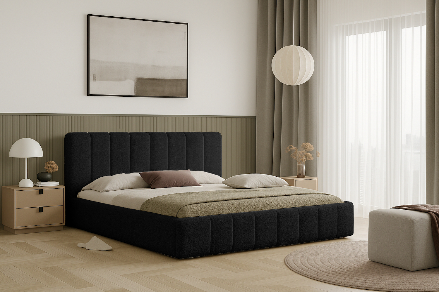 Postel RIMINI 160x200 s úložným prostorem - bouclé - černá Postel RIMINI není jen místem k odpočinku, ale skutečnou oázou klidu, kde jsou detaily dokonale propracované a vytvářejí jedinečnou atmosféru ložnice. Naše elegantní čelo postele nejen dodává posteli charakter, ale také poskytuje ergonomickou oporu vašemu tělu. Postel RIMINI, vyrobená z nejkvalitnějších materiálů a pečlivě zpracovaná, se perfektně hodí do různých stylů ložnic a dodává jim jedinečné kouzlo. Pevný dřevěný rám vyztužený kovovými prvky, zajišťuje nejen stabilitu, ale i trvanlivost nábytku po mnoho let. Dostupnost v různých velikostech a barvách umožňuje, aby se postel RIMINI dokonale přizpůsobila individuálním preferencím každého zákazníka a stala se nenahraditelným prvkem každé ložnice. Bez ohledu na interiérový design, postel RIMINI zaručuje nezapomenutelný spánkový komfort a luxusní design, který zdůrazní jedinečnost vašeho domova. Pořízením naší postele RIMINI investujete nejen do vlastního pohodlí, ale také do estetiky a elegance vašeho obytného prostoru. Dopřejte si chvilku luxusu výběrem naší jedinečné postele RIMINI, která z vašeho spánku udělá nezapomenutelný zážitek plný relaxace a regenerace. Objevte rozdíl, který dokáže vytvořit vysoce kvalitní postel RIMINI, a ponořte se do zážitku naprostého pohodlí a klidu. Vytvořte si vlastní ráj v ložnici a užijte si každý okamžik nádherného spánku obklopeni luxusem a rafinovaným designem. PROVEDENÍ Postel je vybavena dřevěným zvedacím rámem, rám matrace se skládá z 32 pružinových lamel, které mají pozitivní vliv na pohodlí spánku. Rám se zvedá pomocí kovového pružinového mechanismu. Konstrukce je vyrobena z vysoce kvalitní dřevotřísky a dřevěných prvků, což zaručuje trvanlivost postele. Pro výrobu konstrukce našeho nábytku používáme pouze osvědčené polotovary od spolehlivých zdrojů. Kvalitní zpracování, významná část výroby probíhá na přesných CNC strojích. Prošívané čelo postele s vysokopevnostními nitěmi. Uspořádání prošívaného vzoru se může lišit v závislosti na šířce čela postele. Po zvednutí rámu postele je prostor rozdělen přepážkou. Zadní část přepážky nemá spodní desku, pouze přední část má nádobu na ložní prádlo. Maximální nosnost rámu je 400 kg Cena postele nezahrnuje matraci. Produkt pro svépomocnou montáž, jasný návod k montáži a příslušenství součástí sady, zaručují rychlou a bezproblémovou montáž ROZMĚRY Délka - 208 cm Šířka - 170 cm Výška čela postele 86 cm Výška bočnice 30 cm Plocha na spaní - 160x200 cm Rozměrová tolerance +/- 3 cm