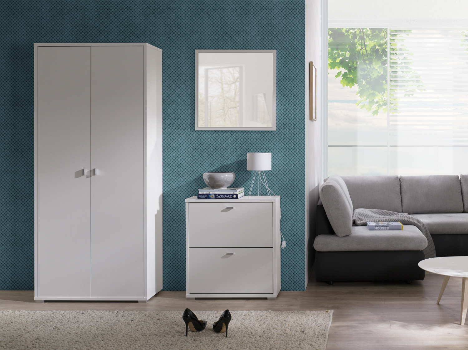 Sada obsahuje: Zrcadlo A01: výška: 65 cm / šířka: 65 cm Botník A02: výška: 77 cm / šířka: 69 cm / hloubka: 25 cm Šatní skříň A05: výška: 195 cm / šířka: 85 cm / hloubka: 34 cm Barva: bílá