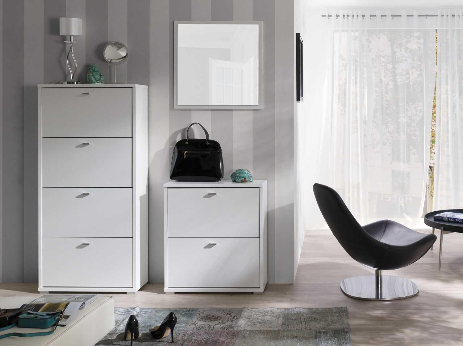 Sada obsahuje: Zrcadlo A01: výška: 65 cm / šířka: 65 cm Botník A02: výška: 77 cm / šířka: 69 cm / hloubka: 25 cm Botník A04: výška: 147 cm / šířka: 69 cm / hloubka: 25 cm Barva: bílá