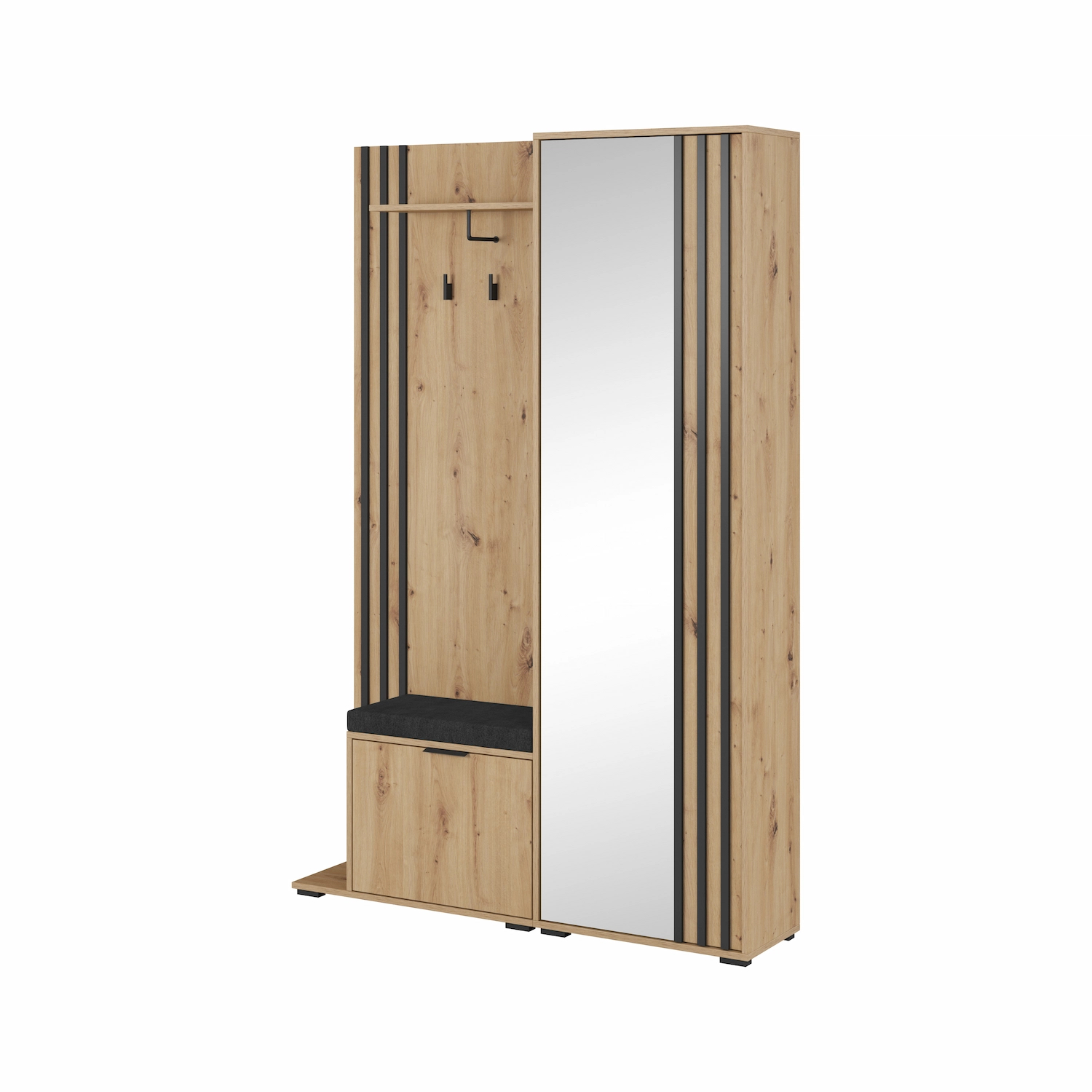 Předsíň NELLY je perfektním řešením pro váš domov. Je to nejen doplněk, ale především efektní dekorace. Kvalitně zpracovaný, funkční a moderní nábytek vám zaručí plnou spokojenost s jeho používáním. Uvnitř skříně jsou dvě výškově nastavitelné police. Tento nábytek je spojením modernosti a praktičnosti, systém poskytuje mnoho úložného prostoru. Jeho jedinečný charakter způsobují dekorace v podobě lamel. BARVA: DUB ARTISAN + ČERNÁ Provedení Oboustranně laminovaná deska tloušťky 16 mm Hrany dodatečně zakončené ABS dýhou MDF deska Zadní strana šatní skříně je vyrobena z HDF desky Předsíň je dostupná ve 3 barevných variantách Design nábytku bez úchytek (systém push-to-open) Odolná a pevná konstrukce možnost s poduškou na botník nebo bez Rozměry Šířka: 132 cm Výška: 192 cm Hloubka: 40 cm rozměry podušky Šířka: 60 cm Výška: 5 cm Hloubka: 39 cm