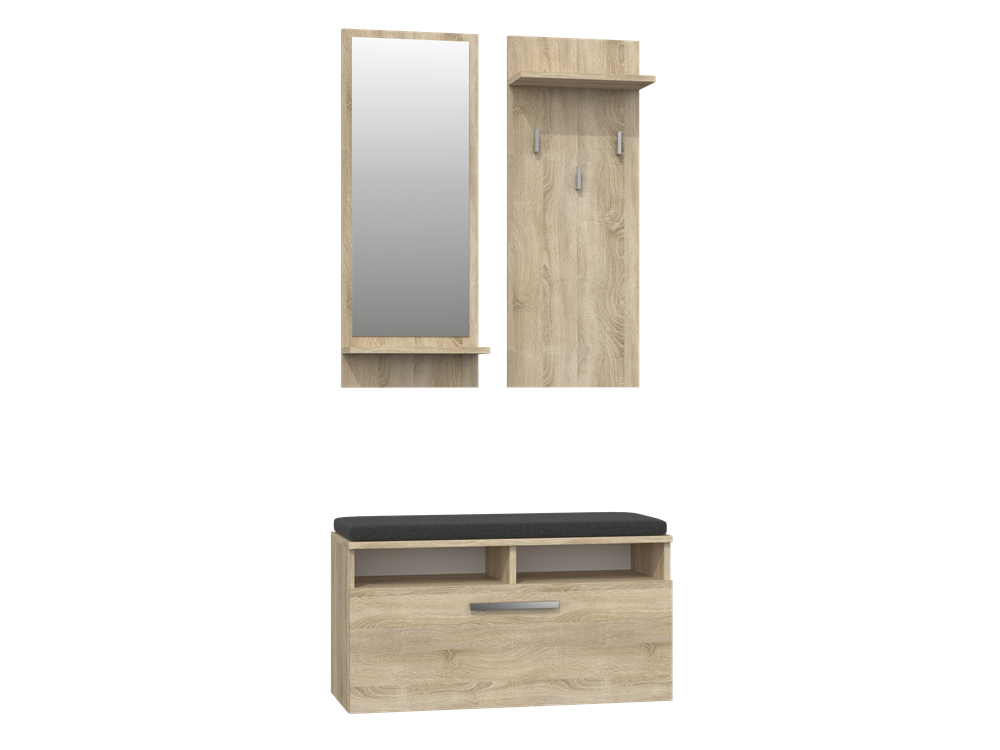 ŠATNÍ SKŘÍŇ NA CHODBĚ MODEL: "RIVA"ZRCADLO S POLIČKOUVĚŠÁK S POLIČKOUSKŘÍŇKA SE SEDAČKOU A PRAKTICKÝM ODKLÁDACÍM PROSTOREMBARVA: DUB SONOMA Ideální nabídka pro lidi, kteří ocení krásný nábytek ve svém bytě.Nábytek v moderním stylu, který splní očekávání všech, kteří oceňují spojení jednoduchosti a elegance.Náš botník je vyroben z laminované desky o tloušťce 16 mm, která je odolná proti oděru. Viditelné hrany jsou kryté ABS hranou. Botník se sedákem a úložným prostorem 6 polic Praktické zrcadlo s poličkou 3 věšáky Polský výrobce ROZMĚRY VĚŠÁKU/ZRCADLA: Hloubka: 16 cmŠířka: 35 cmVýška: 90 cm ROZMĚRY SKŘÍNĚ: Hloubka: 35 cmŠířka: 85 cmVýška: 46 cm MATERIÁL: Korpus a čela - laminovaná dřevotříska o tloušťce 16 mm.Hrany – povrchově upraveny materiálem ABS (vyznačují se vysokou mechanickou a chemickou odolností) Použití: Očistěte povrch nábytku měkkým hadříkem. Vyhněte se používání agresivních chemikálií. V balení: Montážní návod s veškerým potřebným montážním příslušenstvím. Nábytek je z výroby zabalen pro vlastní montáž.