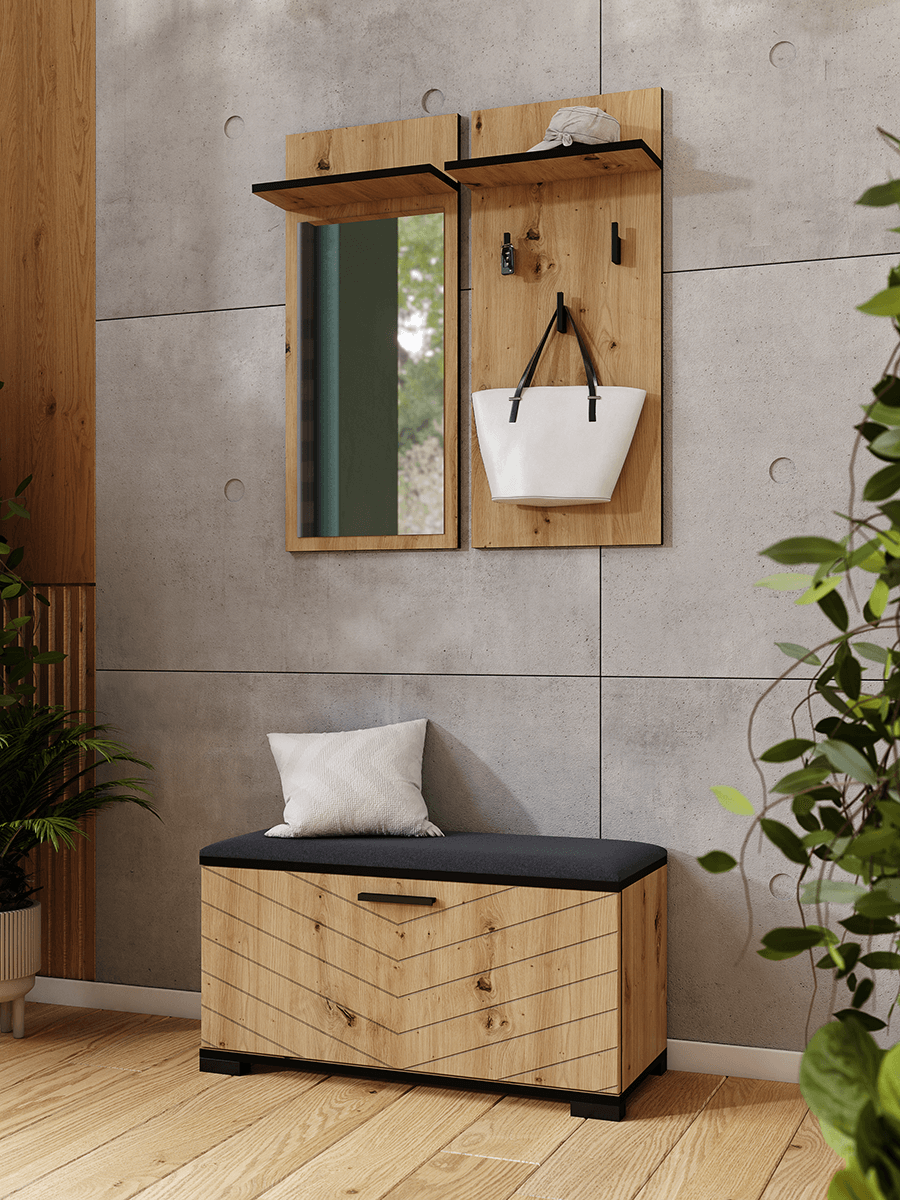 Sada obsahuje (šířka / výška / hloubka): Botník (85/46/35) Panel se zrcadlem (40/90/15) Panel s věšáky (40/90/15)