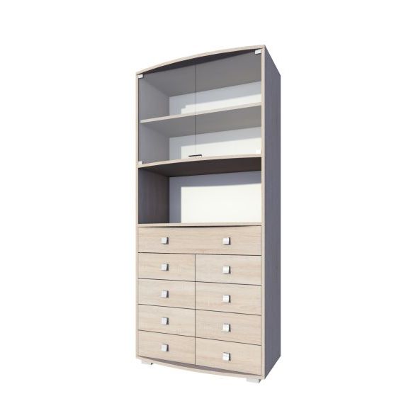 Regál ze systému Naomi s 9 šuplíky, skleněné dvířka šířka 94 cm výška 200 cm hloubka 40 cm