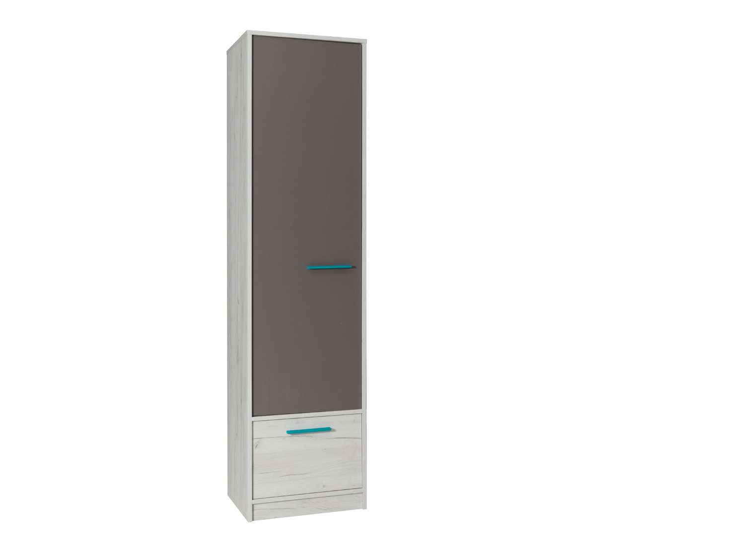 Rozměry: výška 195 cm šířka 50 cm hloubka 45 cm Barva: dub craft bílý / šedý Barva rukojetí, ze kterých si můžete vybrat : tyrkysová - barva 01 šedá - barva 02 žlutá - barva 03 růžová - barva 04 Systém mládeže Rest zahrnuje praktické police (obě otevřené - na které můžete položit předměty, které chcete vystavit, např. suvenýry, knihy, fotografie a zavřené). Kromě toho systém obsahuje také komodu (s hlubokými zásuvkami pro plnou výšku), pohodlnou postel se 4 zásuvkami a prostorné skříně.Prvky ze systému Rest byly velmi oblíbené na posledním veletrhu nábytku v Poznani - Meble Polska 2016