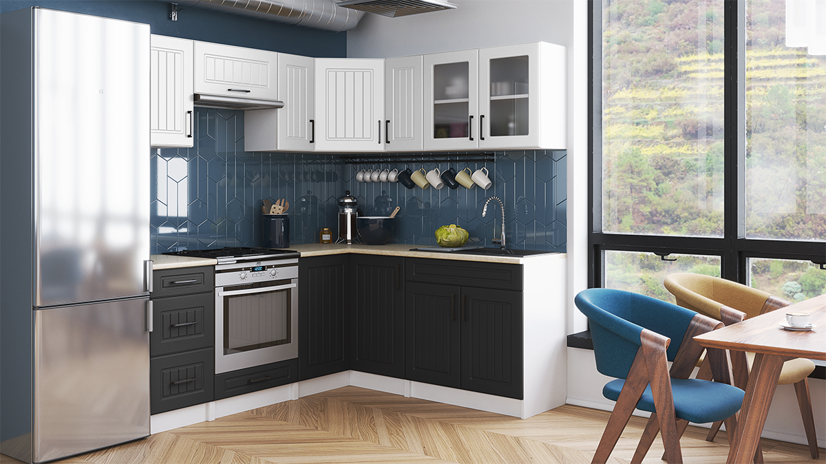 ROZMĚRY: Šířka spodních skříněk: 190 cm x 170 cm Šířka horních skříněk: 190 cm x 170 cm Výška spodních skříněk: 86 cm (2,8 cm pracovní deska / 10 cm sokl) Výška horních skříněk: 58 cm Hloubka horních skříněk: 30 cm Hloubka spodních skříněk: 45 cm Hloubka pracovní desky: 60 cm