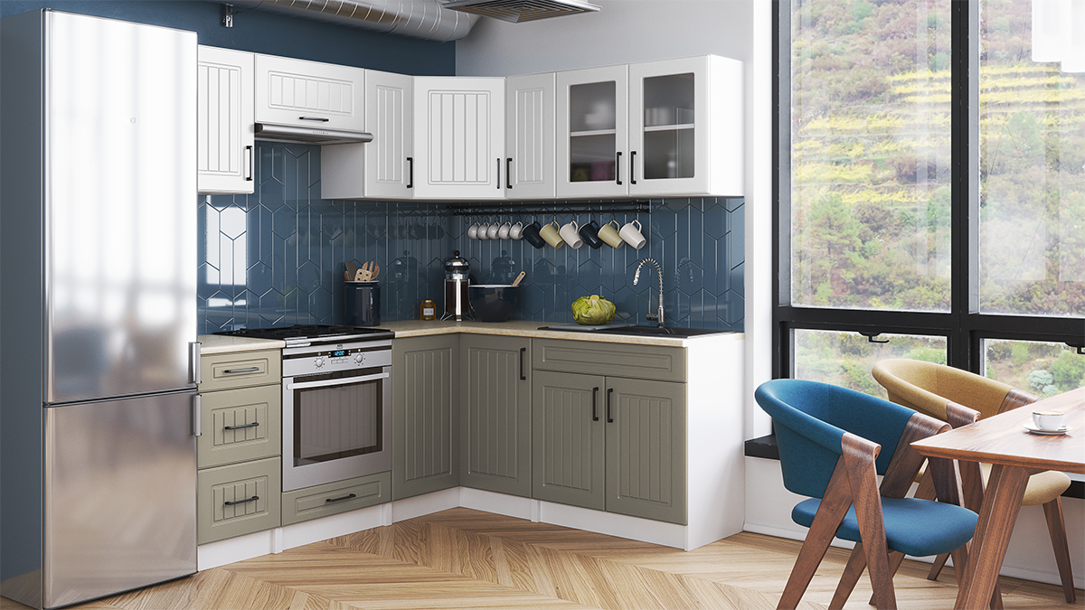 ROZMĚRY: Šířka spodních skříněk: 190 cm x 170 cm Šířka horních skříněk: 190 cm x 170 cm Výška spodních skříněk: 86 cm (2,8 cm pracovní deska / 10 cm sokl) Výška horních skříněk: 58 cm Hloubka horních skříněk: 30 cm Hloubka spodních skříněk: 45 cm Hloubka pracovní desky: 60 cm