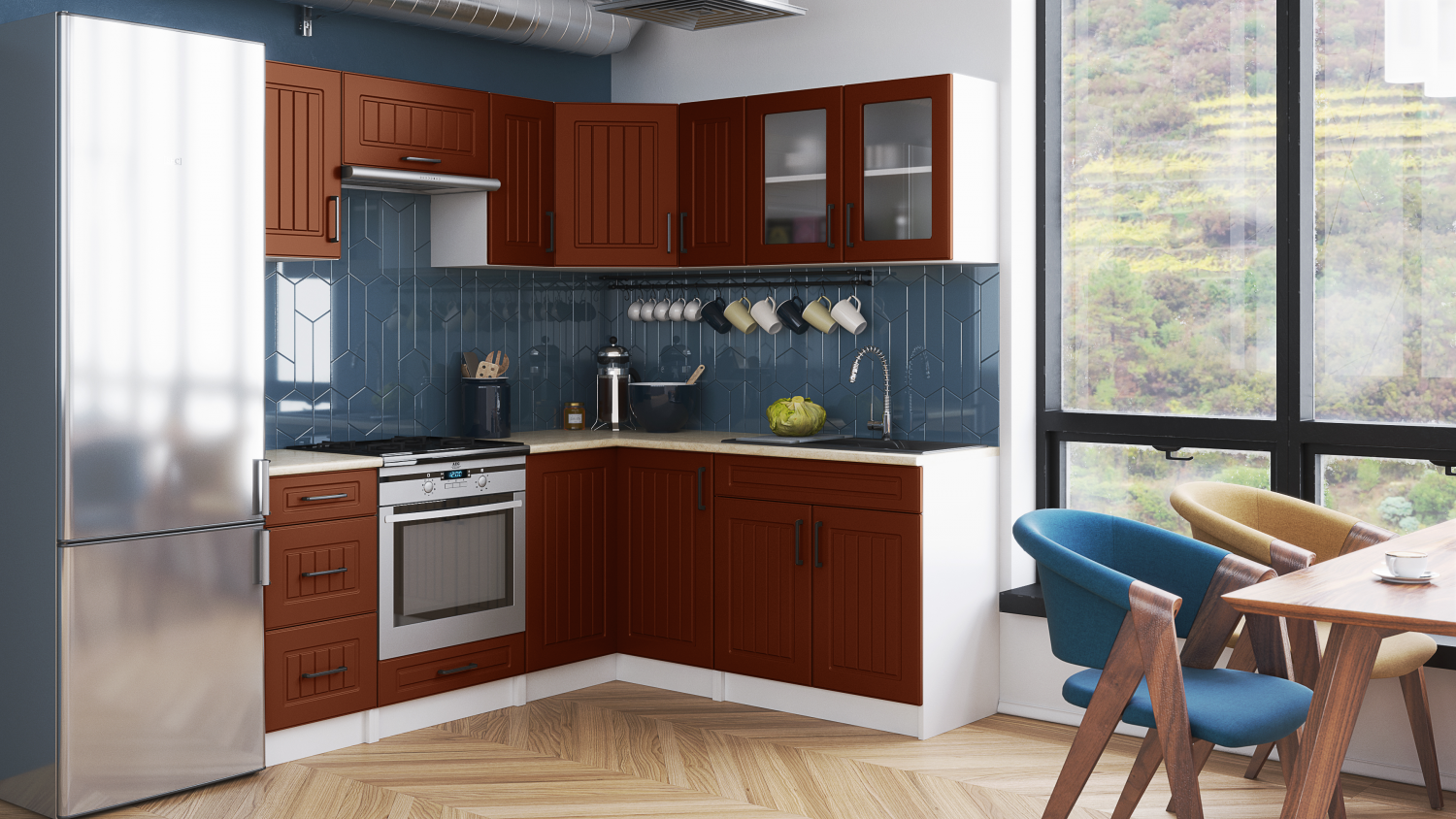 ROZMĚRY: Šířka spodních skříněk: 190 cm x 170 cm Šířka horních skříněk: 190 cm x 170 cm Výška spodních skříněk: 86 cm (2,8 cm pracovní deska / 10 cm sokl) Výška horních skříněk: 58 cm Hloubka horních skříněk: 30 cm Hloubka spodních skříněk: 45 cm Hloubka pracovní desky: 60 cm