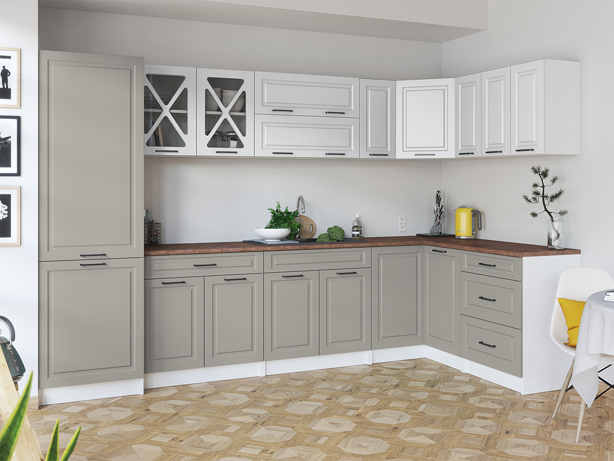 ROZMĚRY: Šířka spodních skříněk: 310 cm / 150 cm ŠÍřka horních skříněk: 310 cm / 150 cm Výška spodních skříněk: 86 cm (2,8 cm pracovní desky / 10 cm sokl) Výška horních skříněk: 58 cm Výška sloupku: 201 cm Hloubka sloupku: 56 cm Hloubka horních skříněk: 30 cm Hloubka spodních skříněk: 45 cm Hloubka pracovní desky: 60 cm