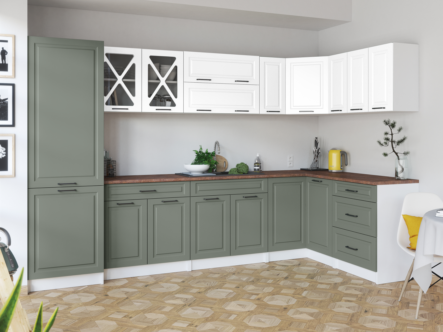 Domů Nábytek Kuchyně Kuchyňské linky FRONTI Rohová kuchyňská linka SINGRID - Bílá + olive