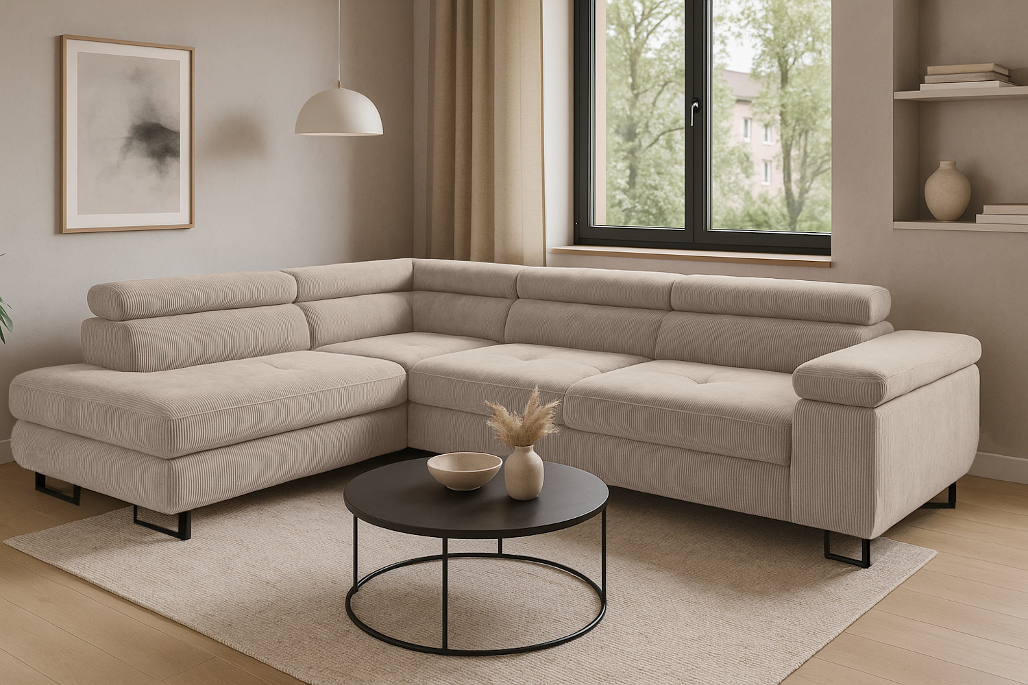Rohová rozkládací sedačka ANTONIO - béžová - manšestrová látka Rohová pohovka Antonio - pohodlí, které upoutá pozornost Hledáte rohovou pohovku, která dokonale kombinuje styl a funkčnost? Antonio je moderní kus nábytku vytvořený s ohledem na pohodlné bydlení - ideální pro rodiny, hosty a každého, kdo oceňuje design na nejvyšší úrovni. Díky svému geometrickému, modernímu tvaru a pečlivě vybraným materiálům se Antonio rychle stane ústředním bodem obývacího pokoje. Vysoce kvalitní manšestrová tkanina nejenže vypadá elegantně, ale také skvěle funguje při každodenním používání. Pohodlí používání je zajištěno výplní sedáku elastickou pěnou T30 a vlnitými pružinami, díky nimž se nábytek přizpůsobí tělu a nabízí pohodlí na nejvyšší úrovni. Antonio je také praktickým řešením pro ty, kteří oceňují multifunkčnost - vestavěná funkce spaní o rozloze 125 x 195 centimetrů umožňuje rychle proměnit rohovou pohovku v prostornou postel, ideální pro dvě osoby. Prostorný prostor na ložní prádlo skrytý v nábytkové krabici navíc usnadňuje ukládání a udržování pořádku. Nastavitelné opěrky hlavy a široká loketní opěrka zvyšují pohodlí každodenního používání a pevná konstrukce z dřevotřísky a vybraného měkkého dřeva zajišťuje odolnost a stabilitu po mnoho let. Rohová pohovka Antonio je volně stojící, s esteticky upraveným opěradlem, které umožňuje její volné umístění kamkoli v místnosti. K dispozici v levém nebo pravém provedení a s výběrem barvy nohou - černá nebo chrom - perfektně se hodí do různých interiérových designů. Produkt určený pro svépomocnou montáž s jasným návodem a sadou potřebného příslušenství. Antonio není jen kus nábytku, je to promyšlený prvek domácího prostoru, který kombinuje styl, pohodlí a funkci v jedné ucelené formě. PROVEDENÍ Vysoce kvalitní dřevotříska, sololit a dřevěné prvky Vysoce elastická polyuretanová pěna T-30 Sedáky vyrobené na vlnové pružině Úložný prostor na ložní prádlo Funkce spaní - 125x195 cm Samostatně stojící rohová pohovka - opěradlo čalouněné látkou Černé nebo stříbrné chromované kovové nohy Rohová pohovka má nastavitelné opěrky hlavy a pohodlnou a prostornou loketní opěrku Možnost výběru strany - PRAVÁ/LEVÁ Rohová pohovka pro svépomocnou montáž - srozumitelný návod a potřebné příslušenství součástí balení ROZMĚRY Šířka - 270 cm Délka - 200 cm Hloubka sedáku - 62 cm Výška sedáku - 42 cm Výška nohou - 9 cm Výška - 60-90 cm Plocha na spaní - 125x195 cm Rozměrová tolerance +/- 3 cm