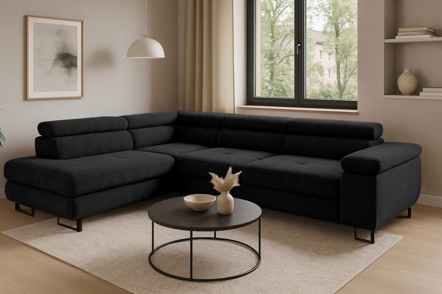 Rohová rozkládací sedačka ANTONIO - černá - manšestrová látka Rohová pohovka Antonio - pohodlí, které upoutá pozornost Hledáte rohovou pohovku, která dokonale kombinuje styl a funkčnost? Antonio je moderní kus nábytku vytvořený s ohledem na pohodlné bydlení - ideální pro rodiny, hosty a každého, kdo oceňuje design na nejvyšší úrovni. Díky svému geometrickému, modernímu tvaru a pečlivě vybraným materiálům se Antonio rychle stane ústředním bodem obývacího pokoje. Vysoce kvalitní manšestrová tkanina nejenže vypadá elegantně, ale také skvěle funguje při každodenním používání. Pohodlí používání je zajištěno výplní sedáku elastickou pěnou T30 a vlnitými pružinami, díky nimž se nábytek přizpůsobí tělu a nabízí pohodlí na nejvyšší úrovni. Antonio je také praktickým řešením pro ty, kteří oceňují multifunkčnost - vestavěná funkce spaní o rozloze 125 x 195 centimetrů umožňuje rychle proměnit rohovou pohovku v prostornou postel, ideální pro dvě osoby. Prostorný prostor na ložní prádlo skrytý v nábytkové krabici navíc usnadňuje ukládání a udržování pořádku. Nastavitelné opěrky hlavy a široká loketní opěrka zvyšují pohodlí každodenního používání a pevná konstrukce z dřevotřísky a vybraného měkkého dřeva zajišťuje odolnost a stabilitu po mnoho let. Rohová pohovka Antonio je volně stojící, s esteticky upraveným opěradlem, které umožňuje její volné umístění kamkoli v místnosti. K dispozici v levém nebo pravém provedení a s výběrem barvy nohou - černá nebo chrom - perfektně se hodí do různých interiérových designů. Produkt určený pro svépomocnou montáž s jasným návodem a sadou potřebného příslušenství. Antonio není jen kus nábytku, je to promyšlený prvek domácího prostoru, který kombinuje styl, pohodlí a funkci v jedné ucelené formě. PROVEDENÍ Vysoce kvalitní dřevotříska, sololit a dřevěné prvky Vysoce elastická polyuretanová pěna T-30 Sedáky vyrobené na vlnové pružině Úložný prostor na ložní prádlo Funkce spaní - 125x195 cm Samostatně stojící rohová pohovka - opěradlo čalouněné látkou Černé nebo stříbrné chromované kovové nohy Rohová pohovka má nastavitelné opěrky hlavy a pohodlnou a prostornou loketní opěrku Možnost výběru strany - PRAVÁ/LEVÁ Rohová pohovka pro svépomocnou montáž - srozumitelný návod a potřebné příslušenství součástí balení ROZMĚRY Šířka - 270 cm Délka - 200 cm Hloubka sedáku - 62 cm Výška sedáku - 42 cm Výška nohou - 9 cm Výška - 60-90 cm Plocha na spaní - 125x195 cm Rozměrová tolerance +/- 3 cm