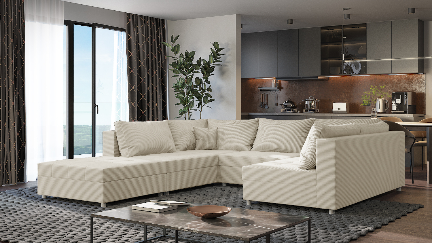 Rohová rozkládací sedačka DENVER - komfort a funkčnost v jednom Rohová sedačka DENVER je elegantní a funkční řešení pro váš obývací pokoj. Díky svému designu ve tvaru písmene U poskytuje dostatek místa pro celou rodinu a přátele. A když přijde čas na odpočinek, snadno ji rozložíte na prostorné a pohodlné lůžko, které se skvěle hodí pro přespání nečekaných hostů. Kromě toho v sobě ukrývá i praktický úložný prostor, kam můžete uložit lůžkoviny nebo cokoliv, co chcete mít po ruce, ale zároveň schované. Vyberte si styl, který sedí k vám Sedačka Denver je dostupná ve třech stylových variantách, které se hodí do každého interiéru. Pokud dáváte přednost kombinaci materiálů, zvolte provedení s potahem z látek Sawana a Dolaro. Pro milovníky jemných a hebkých textur je ideální varianta s pruhovanou látkou Lincoln. A jestli toužíte po moderním a čistém vzhledu, sáhněte po variantě s hladkou látkou Fresh. S robustní konstrukcí a potahy odolnými proti opotřebení si můžete být jistí, že vám sedačka DENVER bude dělat radost po dlouhá léta. UPOZORNĚNÍ: U tohoto produktu vyžadujeme platbu předem. NELZE objednat na dobírku. PROVEDENÍ Funkce spaní rozložením části nad úložným prostorem (275x110 cm) a nebo přidáním bočního taburetu (275x180 cm) Pohovka vyplněna vysokoelastickou čalounickou pěnou T2844 + lehká čalounická výplň Owata 100g Vlnové pružiny v sedáku Dodatečný úložný prostor na lůžkoviny Jemná pruhovaná látka Lincoln připomínající manšestr Sada obsahuje 7 polštářů na opěradlo + 2 malé dekorační Chromové nohy ROZMĚRY Šířka - 288 cm Hloubka - 199 cm Hloubka sedáku - 81/85 cm Vnitřní prostor - 95 x 99 cm Rozměr taburetu - 95 x 99 cm Povrch spaní - 275 x 180 cm Rozměrová tolerance +/- 3 cm.