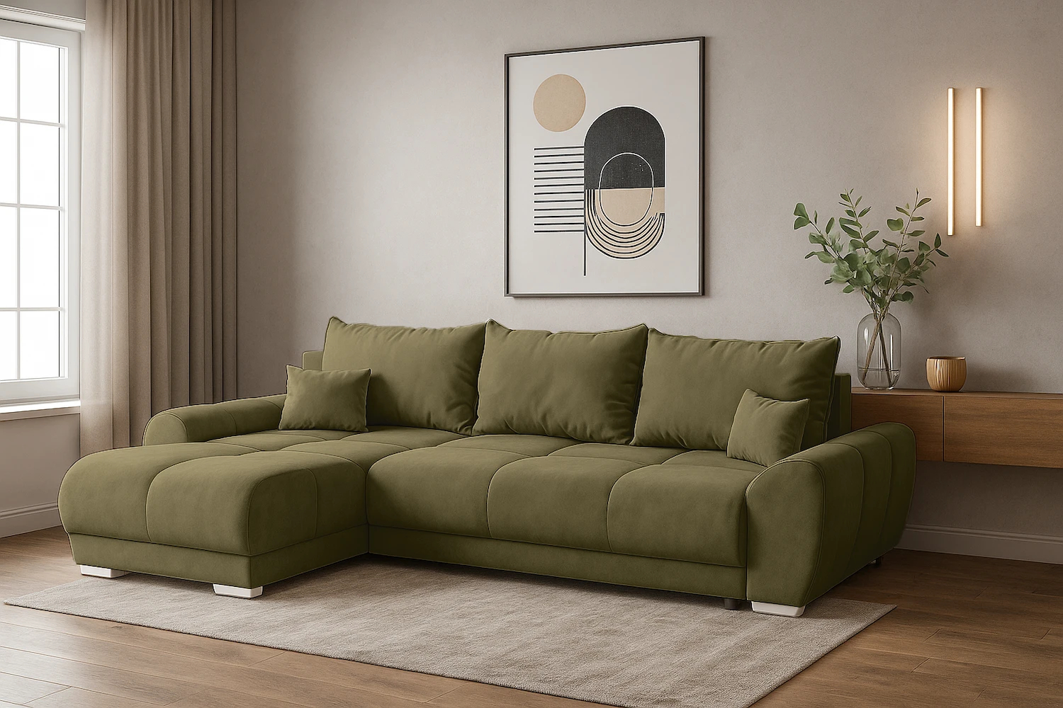 Rohová rozkládací sedačka EDGAR - olivová Rohová pohovka EDGAR – moderní pohodlí a styl Rohová pohovka EDGAR je elegantní a funkční kus nábytku, který se bude perfektně hodit do moderního interiéru. Čalouněná mimořádně odolnou a voděodolnou látkou Monolith kombinuje estetiku s praktičností, což zajišťuje snadné čištění a odolnost vůči každodennímu používání. Na výběr je možné zvolit stranu rohové pohovky, což umožňuje její přizpůsobení jakémukoli uspořádání místnosti. Toto řešení činí z EDGARa ideální řešení pro malé i větší obývací pokoje. Pohodlná funkce spaní a praktický úložný prostor Model EDGAR je vybaven funkcí spaní s prostornou plochou o rozměrech 130x220 cm, což z něj činí ideální řešení i pro hosty. Další výhodou je prostorná přihrádka na ložní prádlo, diskrétně skrytá v korpusu nábytku, která usnadňuje udržování pořádku. Pohodlí používání zajišťuje výplň z vlnité pružiny a vysoce kvalitní pěny T-30, které zaručují pohodlí a odolnost proti deformaci. Vkusné prošívání na sedáku a opěradlech dodává rohové pohovce stylový vzhled, který zdůrazňuje její moderní charakter. Solidní zpracování a odolné materiály dělají z rohové pohovky Edgar investici na mnoho let. Je to vynikající volba pro lidi, kteří si cení pohodlí, moderního designu a praktických řešení v jednom. PROVEDENÍ Vysoce kvalitní dřevotříska, sololit a dřevěné prvky Vysoce elastická polyuretanová pěna T-30 Sedáky vyrobené na vlnové pružině Prostorná nádoba na ložní prádlo Funkce spaní - 130x220 cm Volně stojící rohová pohovka - opěradlo čalouněné látkou Nohy stříbrného chromu Možnost volby strany - PRAVÁ/LEVÁ Rohová pohovka pro svépomocnou montáž - srozumitelný návod a potřebné příslušenství součástí balení ROZMĚRY Šířka - 290 cm Délka - 183 cm Výška - 85 cm Hloubka sedáku - 72 cm Výška sedáku - 42 cm Výška nohou - 5 cm Plocha na spaní - 130x220 cm Rozměrová tolerance +/- 3 cm