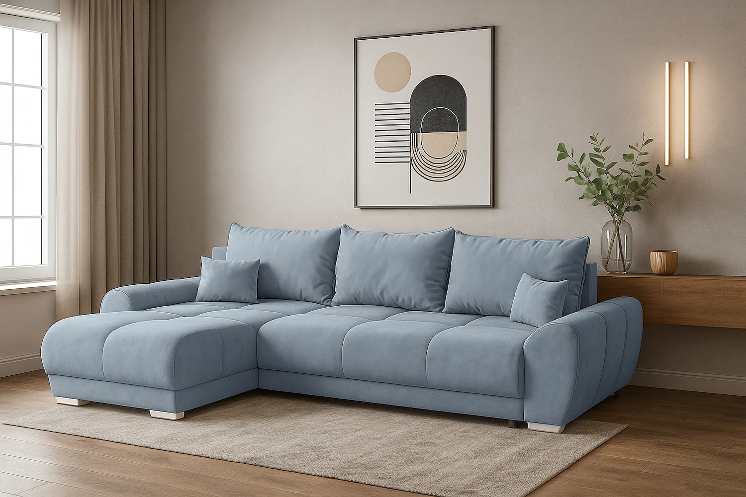 Rohová rozkládací sedačka EDGAR - světlemodrá Rohová pohovka EDGAR – moderní pohodlí a styl Rohová pohovka EDGAR je elegantní a funkční kus nábytku, který se bude perfektně hodit do moderního interiéru. Čalouněná mimořádně odolnou a voděodolnou látkou Monolith kombinuje estetiku s praktičností, což zajišťuje snadné čištění a odolnost vůči každodennímu používání. Na výběr je možné zvolit stranu rohové pohovky, což umožňuje její přizpůsobení jakémukoli uspořádání místnosti. Toto řešení činí z EDGARa ideální řešení pro malé i větší obývací pokoje. Pohodlná funkce spaní a praktický úložný prostor Model EDGAR je vybaven funkcí spaní s prostornou plochou o rozměrech 130x220 cm, což z něj činí ideální řešení i pro hosty. Další výhodou je prostorná přihrádka na ložní prádlo, diskrétně skrytá v korpusu nábytku, která usnadňuje udržování pořádku. Pohodlí používání zajišťuje výplň z vlnité pružiny a vysoce kvalitní pěny T-30, které zaručují pohodlí a odolnost proti deformaci. Vkusné prošívání na sedáku a opěradlech dodává rohové pohovce stylový vzhled, který zdůrazňuje její moderní charakter. Solidní zpracování a odolné materiály dělají z rohové pohovky Edgar investici na mnoho let. Je to vynikající volba pro lidi, kteří si cení pohodlí, moderního designu a praktických řešení v jednom. PROVEDENÍ Vysoce kvalitní dřevotříska, sololit a dřevěné prvky Vysoce elastická polyuretanová pěna T-30 Sedáky vyrobené na vlnové pružině Prostorná nádoba na ložní prádlo Funkce spaní - 130x220 cm Volně stojící rohová pohovka - opěradlo čalouněné látkou Nohy stříbrného chromu Možnost volby strany - PRAVÁ/LEVÁ Rohová pohovka pro svépomocnou montáž - srozumitelný návod a potřebné příslušenství součástí balení ROZMĚRY Šířka - 290 cm Délka - 183 cm Výška - 85 cm Hloubka sedáku - 72 cm Výška sedáku - 42 cm Výška nohou - 5 cm Plocha na spaní - 130x220 cm Rozměrová tolerance +/- 3 cm