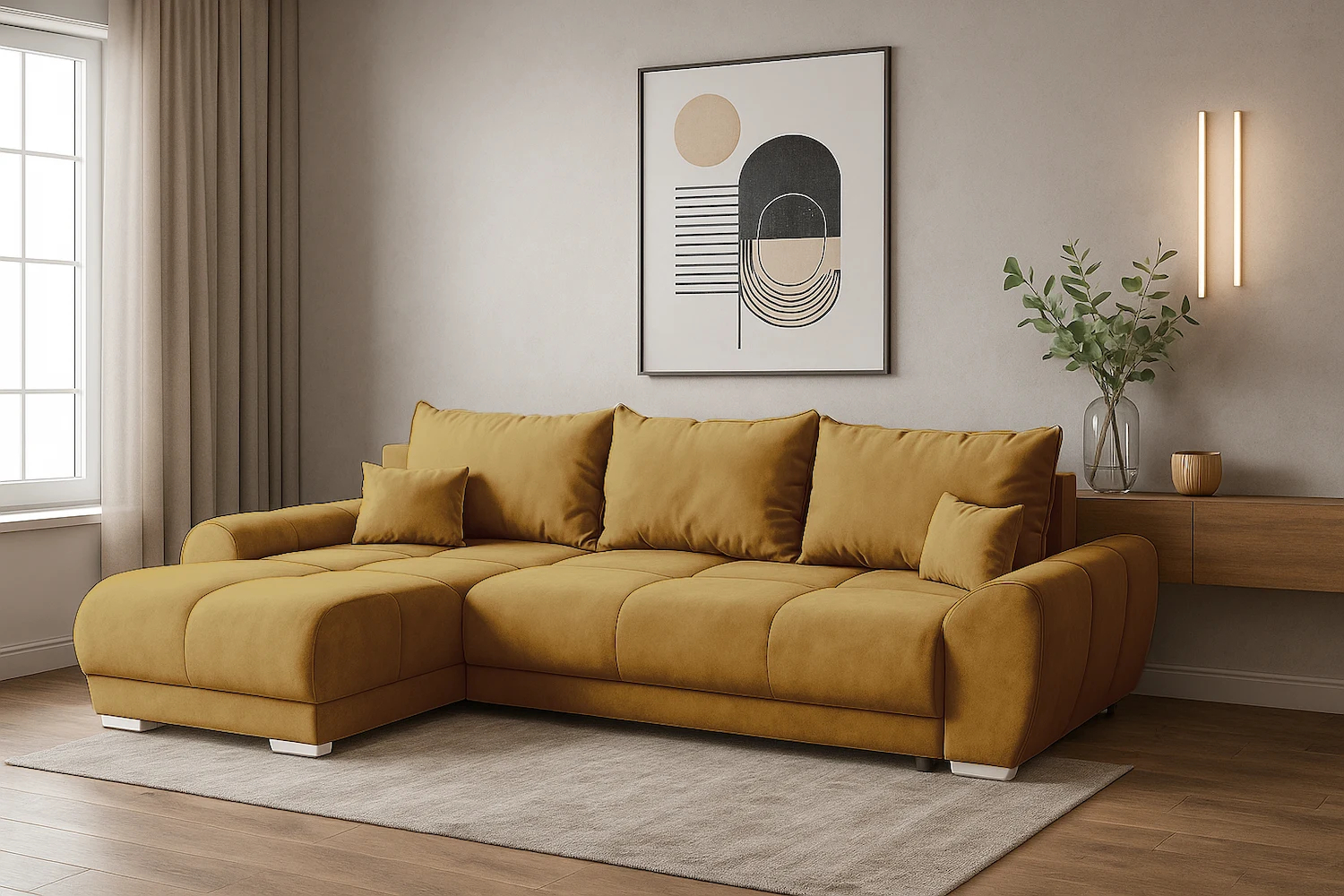 Rohová rozkládací sedačka EDGAR - žlutá Rohová pohovka EDGAR – moderní pohodlí a styl Rohová pohovka EDGAR je elegantní a funkční kus nábytku, který se bude perfektně hodit do moderního interiéru. Čalouněná mimořádně odolnou a voděodolnou látkou Monolith kombinuje estetiku s praktičností, což zajišťuje snadné čištění a odolnost vůči každodennímu používání. Na výběr je možné zvolit stranu rohové pohovky, což umožňuje její přizpůsobení jakémukoli uspořádání místnosti. Toto řešení činí z EDGARa ideální řešení pro malé i větší obývací pokoje. Pohodlná funkce spaní a praktický úložný prostor Model EDGAR je vybaven funkcí spaní s prostornou plochou o rozměrech 130x220 cm, což z něj činí ideální řešení i pro hosty. Další výhodou je prostorná přihrádka na ložní prádlo, diskrétně skrytá v korpusu nábytku, která usnadňuje udržování pořádku. Pohodlí používání zajišťuje výplň z vlnité pružiny a vysoce kvalitní pěny T-30, které zaručují pohodlí a odolnost proti deformaci. Vkusné prošívání na sedáku a opěradlech dodává rohové pohovce stylový vzhled, který zdůrazňuje její moderní charakter. Solidní zpracování a odolné materiály dělají z rohové pohovky Edgar investici na mnoho let. Je to vynikající volba pro lidi, kteří si cení pohodlí, moderního designu a praktických řešení v jednom. PROVEDENÍ Vysoce kvalitní dřevotříska, sololit a dřevěné prvky Vysoce elastická polyuretanová pěna T-30 Sedáky vyrobené na vlnové pružině Prostorná nádoba na ložní prádlo Funkce spaní - 130x220 cm Volně stojící rohová pohovka - opěradlo čalouněné látkou Nohy stříbrného chromu Možnost volby strany - PRAVÁ/LEVÁ Rohová pohovka pro svépomocnou montáž - srozumitelný návod a potřebné příslušenství součástí balení ROZMĚRY Šířka - 290 cm Délka - 183 cm Výška - 85 cm Hloubka sedáku - 72 cm Výška sedáku - 42 cm Výška nohou - 5 cm Plocha na spaní - 130x220 cm Rozměrová tolerance +/- 3 cm