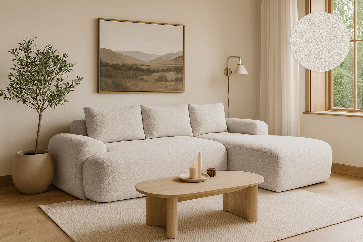 Rohová rozkládací sedačka FLAVIO - bouclé - béžová Rohová pohovka FLAVIO 260x160 cm s funkcí spaní a úložným prostorem – Bestseller mezi moderními rohovými pohovkami. Hledáte rohovou pohovku, která kombinuje moderní design, pohodlí a funkčnost? Rohová pohovka FLAVIO 260 x 160 cm je perfektní volbou do každého obývacího pokoje. Díky svému univerzálnímu tvaru se perfektně hodí do různých stylů interiéru – od moderního, přes skandinávský, až po klasický. BOUCLÉ LÁTKA (NOW OR NEVER) Bouclé látka je skutečnou poezií doteku a textury – zauzlovaný tanec příze, který vytváří povrch plný života, hloubky a jemné nedokonalosti. Představte si mlhavé ráno uzavřené v materiálu – každý zákrut a smyčka je jako kapka rosy, která ještě nestihla spadnout z pavučiny. Bouclé není jen látka – je to příběh vyprávěný šeptem, ve kterém se jemnost a smyslnost prolíná se syrovou povahou vlákna. Každá barva, od tlumené krémové, přes tlumenou olivovou, pudrově růžovou, až po majestátní černou, vypráví jiný příběh. Pro maximální pohodlí je sedák a opěradlo vyrobeno z vlnitých pružin, pružin Bonell a odolné pěny T30, která poskytuje ideální kombinaci pružnosti a odolnosti proti deformaci. Díky tomu rohová pohovka skvěle funguje jak při každodenním používání, tak i jako spací funkce - zaručuje pohodlný spánek a příjemný odpočinek. PROVEDENÍ Rozměry: 260 cm x 160 cm - ideální do prostorných obývacích pokojů, Hluboký sedák a široká lehátka - maximální pohodlí odpočinku,Vysoce kvalitní dřevotříska, sololit a dřevěné prvky Látka BOUCLÉ (NOW OR NEVER) - měkká, příjemná na dotek, snadno se udržuje v čistotě, Funkce spaní - rohová pohovka se rychle promění v pohodlnou postel, Praktický úložný prostor na ložní prádlo, Sedák a opěradlo na vlnové pružině, bonell pružině a pěně T-30 - elastické, odolné a pohodlné, Možnost volby strany - PRAVÁ/LEVÁ Volně stojící rohová pohovka - opěradlo čalouněné látkou Polštáře s granulovanou výplní, jejich hloubka a výška závisí na aktuálním uspořádání výplně Rohová pohovka pro svépomocnou montáž - přiložený přehledný návod a potřebné příslušenství ROZMĚRY Šířka - 260 cm Hloubka - 160 cm Hloubka sedáku k opěradlu - 80 cm Výška sedáku - 40 cm Plocha na spaní - 150x200 cm Rozměrová toelrance +/- 3 cm AUTOMATICKÝ ASISTENT ROZKLÁDÁNÍ (ZA PŘÍPLATEK) Díky použití mechanismu podporujícího rozkládání je rozložení rohu rychlé a snadné. Je to ideální řešení pro lidi, kteří si cení funkčnosti a pohodlí. Video představující sedačku: