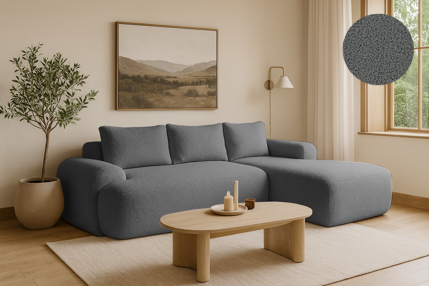 Rohová rozkládací sedačka FLAVIO - bouclé - grafitová Rohová pohovka FLAVIO 260x160 cm s funkcí spaní a úložným prostorem – Bestseller mezi moderními rohovými pohovkami. Hledáte rohovou pohovku, která kombinuje moderní design, pohodlí a funkčnost? Rohová pohovka FLAVIO 260 x 160 cm je perfektní volbou do každého obývacího pokoje. Díky svému univerzálnímu tvaru se perfektně hodí do různých stylů interiéru – od moderního, přes skandinávský, až po klasický. BOUCLÉ LÁTKA (NOW OR NEVER) Bouclé látka je skutečnou poezií doteku a textury – zauzlovaný tanec příze, který vytváří povrch plný života, hloubky a jemné nedokonalosti. Představte si mlhavé ráno uzavřené v materiálu – každý zákrut a smyčka je jako kapka rosy, která ještě nestihla spadnout z pavučiny. Bouclé není jen látka – je to příběh vyprávěný šeptem, ve kterém se jemnost a smyslnost prolíná se syrovou povahou vlákna. Každá barva, od tlumené krémové, přes tlumenou olivovou, pudrově růžovou, až po majestátní černou, vypráví jiný příběh. Pro maximální pohodlí je sedák a opěradlo vyrobeno z vlnitých pružin, pružin Bonell a odolné pěny T30, která poskytuje ideální kombinaci pružnosti a odolnosti proti deformaci. Díky tomu rohová pohovka skvěle funguje jak při každodenním používání, tak i jako spací funkce - zaručuje pohodlný spánek a příjemný odpočinek. PROVEDENÍ Rozměry: 260 cm x 160 cm - ideální do prostorných obývacích pokojů, Hluboký sedák a široká lehátka - maximální pohodlí odpočinku,Vysoce kvalitní dřevotříska, sololit a dřevěné prvky Látka BOUCLÉ (NOW OR NEVER) - měkká, příjemná na dotek, snadno se udržuje v čistotě, Funkce spaní - rohová pohovka se rychle promění v pohodlnou postel, Praktický úložný prostor na ložní prádlo, Sedák a opěradlo na vlnové pružině, bonell pružině a pěně T-30 - elastické, odolné a pohodlné, Možnost volby strany - PRAVÁ/LEVÁ Volně stojící rohová pohovka - opěradlo čalouněné látkou Polštáře s granulovanou výplní, jejich hloubka a výška závisí na aktuálním uspořádání výplně Rohová pohovka pro svépomocnou montáž - přiložený přehledný návod a potřebné příslušenství ROZMĚRY Šířka - 260 cm Hloubka - 160 cm Hloubka sedáku k opěradlu - 80 cm Výška sedáku - 40 cm Plocha na spaní - 150x200 cm Rozměrová toelrance +/- 3 cm AUTOMATICKÝ ASISTENT ROZKLÁDÁNÍ (ZA PŘÍPLATEK) Díky použití mechanismu podporujícího rozkládání je rozložení rohu rychlé a snadné. Je to ideální řešení pro lidi, kteří si cení funkčnosti a pohodlí. Video představující sedačku:
