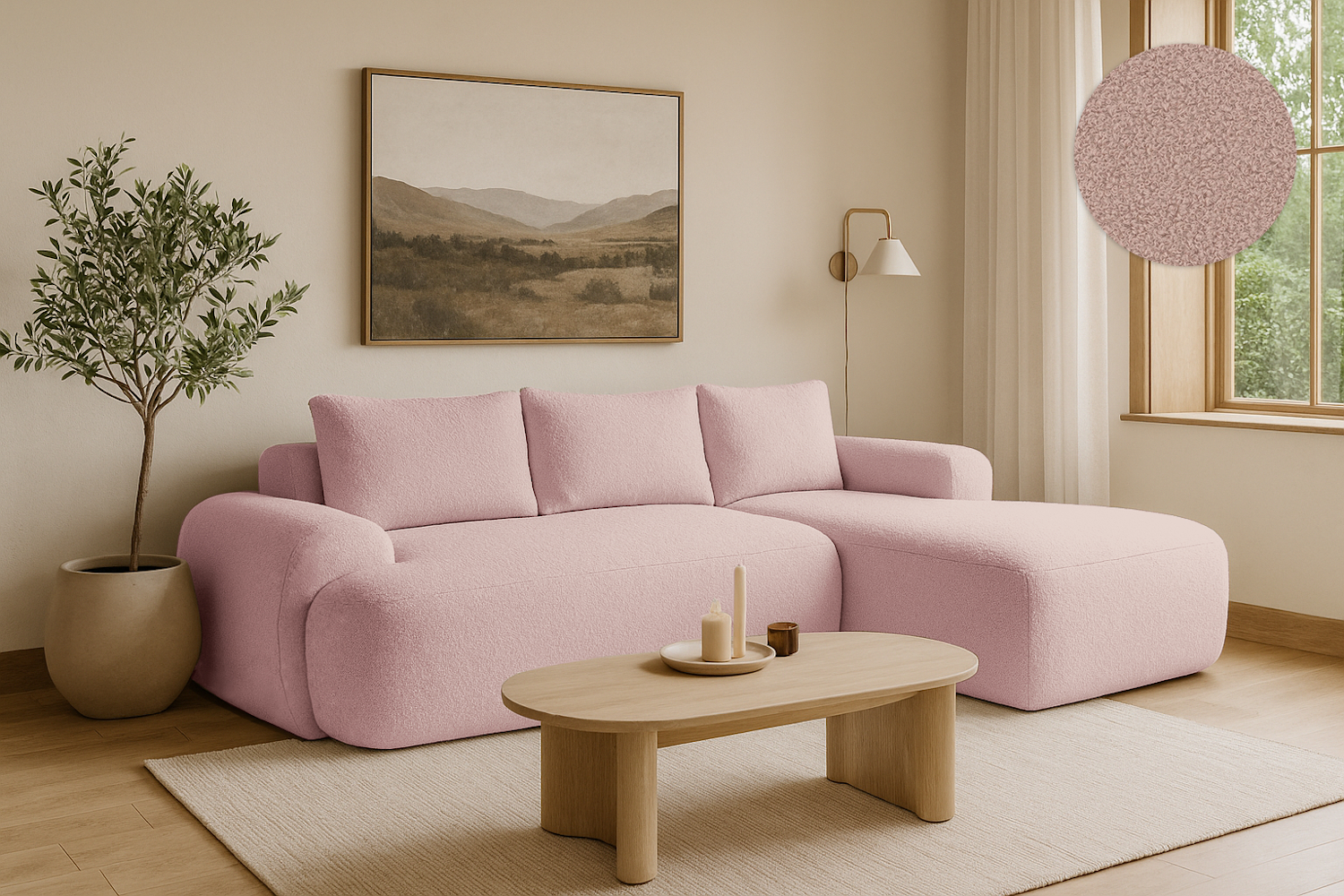 Rohová rozkládací sedačka FLAVIO - bouclé - růžová Rohová pohovka FLAVIO 260x160 cm s funkcí spaní a úložným prostorem – Bestseller mezi moderními rohovými pohovkami. Hledáte rohovou pohovku, která kombinuje moderní design, pohodlí a funkčnost? Rohová pohovka FLAVIO 260 x 160 cm je perfektní volbou do každého obývacího pokoje. Díky svému univerzálnímu tvaru se perfektně hodí do různých stylů interiéru – od moderního, přes skandinávský, až po klasický. BOUCLÉ LÁTKA (NOW OR NEVER) Bouclé látka je skutečnou poezií doteku a textury – zauzlovaný tanec příze, který vytváří povrch plný života, hloubky a jemné nedokonalosti. Představte si mlhavé ráno uzavřené v materiálu – každý zákrut a smyčka je jako kapka rosy, která ještě nestihla spadnout z pavučiny. Bouclé není jen látka – je to příběh vyprávěný šeptem, ve kterém se jemnost a smyslnost prolíná se syrovou povahou vlákna. Každá barva, od tlumené krémové, přes tlumenou olivovou, pudrově růžovou, až po majestátní černou, vypráví jiný příběh. Pro maximální pohodlí je sedák a opěradlo vyrobeno z vlnitých pružin, pružin Bonell a odolné pěny T30, která poskytuje ideální kombinaci pružnosti a odolnosti proti deformaci. Díky tomu rohová pohovka skvěle funguje jak při každodenním používání, tak i jako spací funkce - zaručuje pohodlný spánek a příjemný odpočinek. PROVEDENÍ Rozměry: 260 cm x 160 cm - ideální do prostorných obývacích pokojů, Hluboký sedák a široká lehátka - maximální pohodlí odpočinku,Vysoce kvalitní dřevotříska, sololit a dřevěné prvky Látka BOUCLÉ (NOW OR NEVER) - měkká, příjemná na dotek, snadno se udržuje v čistotě, Funkce spaní - rohová pohovka se rychle promění v pohodlnou postel, Praktický úložný prostor na ložní prádlo, Sedák a opěradlo na vlnové pružině, bonell pružině a pěně T-30 - elastické, odolné a pohodlné, Možnost volby strany - PRAVÁ/LEVÁ Volně stojící rohová pohovka - opěradlo čalouněné látkou Polštáře s granulovanou výplní, jejich hloubka a výška závisí na aktuálním uspořádání výplně Rohová pohovka pro svépomocnou montáž - přiložený přehledný návod a potřebné příslušenství ROZMĚRY Šířka - 260 cm Hloubka - 160 cm Hloubka sedáku k opěradlu - 80 cm Výška sedáku - 40 cm Plocha na spaní - 150x200 cm Rozměrová toelrance +/- 3 cm AUTOMATICKÝ ASISTENT ROZKLÁDÁNÍ (ZA PŘÍPLATEK) Díky použití mechanismu podporujícího rozkládání je rozložení rohu rychlé a snadné. Je to ideální řešení pro lidi, kteří si cení funkčnosti a pohodlí. Video představující sedačku:
