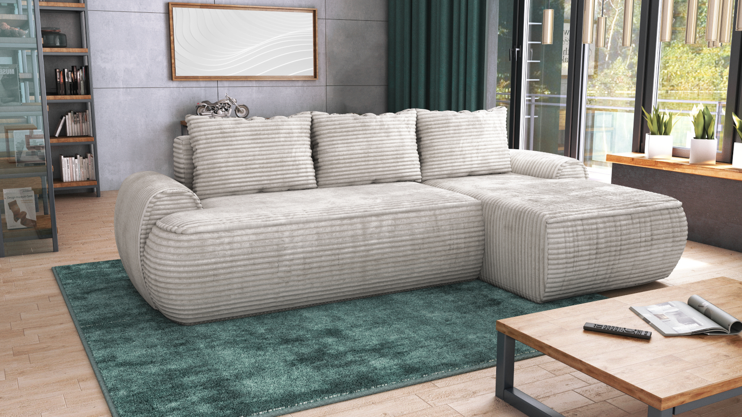 Rohová rozkládací sedačka FLAVIO - šedá Rohová sedací souprava FLAVIO 260x160 cm s funkcí spaní a úložným prostorem – Bestseller mezi moderními rohovými sedacími soupravami. Hledáte rohovou sedací soupravu, která spojuje moderní design, pohodlí a funkčnost? Rohová sedací souprava FLAVIO 260 x 160 cm je perfektní volbou do každého obývacího pokoje. Díky svému univerzálnímu tvaru se skvěle hodí do různých stylů interiéru – od moderního, přes skandinávský až po klasický. Módní design v manšestru TILIA, který si zamilujete na první dotek. Rohová sedací souprava FLAVIO, vyrobená z na dotek mimořádně příjemného materiálu TILIA, zaujme nejen svým vzhledem, ale také komfortem používání. Hluboký sedák a 100 cm široká lenoška zajistí pohodlí a relaxaci po dlouhém dni. Je to skvělé místo k odpočinku, trávení času s rodinou nebo sledování filmů. Pro maximální pohodlí jsou sedák a opěrák vyrobeny z vlnových pružin, bonellových pružin a odolné pěny T30, která poskytuje ideální kombinaci elasticity a odolnosti proti deformaci. Díky tomu je rohová pohovka perfektní jak pro každodenní použití, tak pro spaní – zaručuje pohodlný spánek a odpočinek. PROVEDENÍ Rozměry: 260 cm x 160 cm – ideální do prostorných obývacích pokojů, Hluboký sedák a široká lenoška – maximální komfort odpočinku, Vysoce kvalitní dřevotřískové desky, dřevovláknité desky a dřevěné prvky Tkanina TILIA – měkká, příjemná na dotek, snadno se udržuje v čistotě, Funkce spaní – rohová pohovka se rychle promění v pohodlnou postel, Nádoba na lůžkoviny – praktický a objemný úložný prostor, Sedák a opěrák s vlnovou pružinou, bonellovou pružinou a T-30 pěnou – elastické, odolné a pohodlné, Možnost výběru strany - PRAVÁ/LEVÁ Volně stojící rohová sedací souprava - záda potažena látkou Univerzální tvar – možnost instalace rohové sedací soupravy s levou nebo pravou lenoškou. Polštáře s všitým zipem s možností výměny vsadky Polštáře s granulátovou výplní, jejich hloubka a výška závisí na aktuálním uspořádání výplně Nábytek pro svépomocnou montáž - srozumitelný návod a potřebné příslušenství v ceně ROZMĚRY Šířka - 260 cm Hloubka - 160 cm Hloubka sedáku po opěradlo - 80 cm Výška sedáku - 40 cm Plocha na spaní - 160x200 cm Rozměrová tolerance +/- 3 cm AUTOMATICKÁ POMOC PŘI ROZKLÁDÁNÍ (ZA PŘÍPLATEK) Díky použití rozkládacího opěrného mechanismu (automat DL) je rozkládání pohovky rychlé a bez námahy. Perfektní řešení pro ty, kteří oceňují funkčnost a pohodlí. Video představující sedačku: