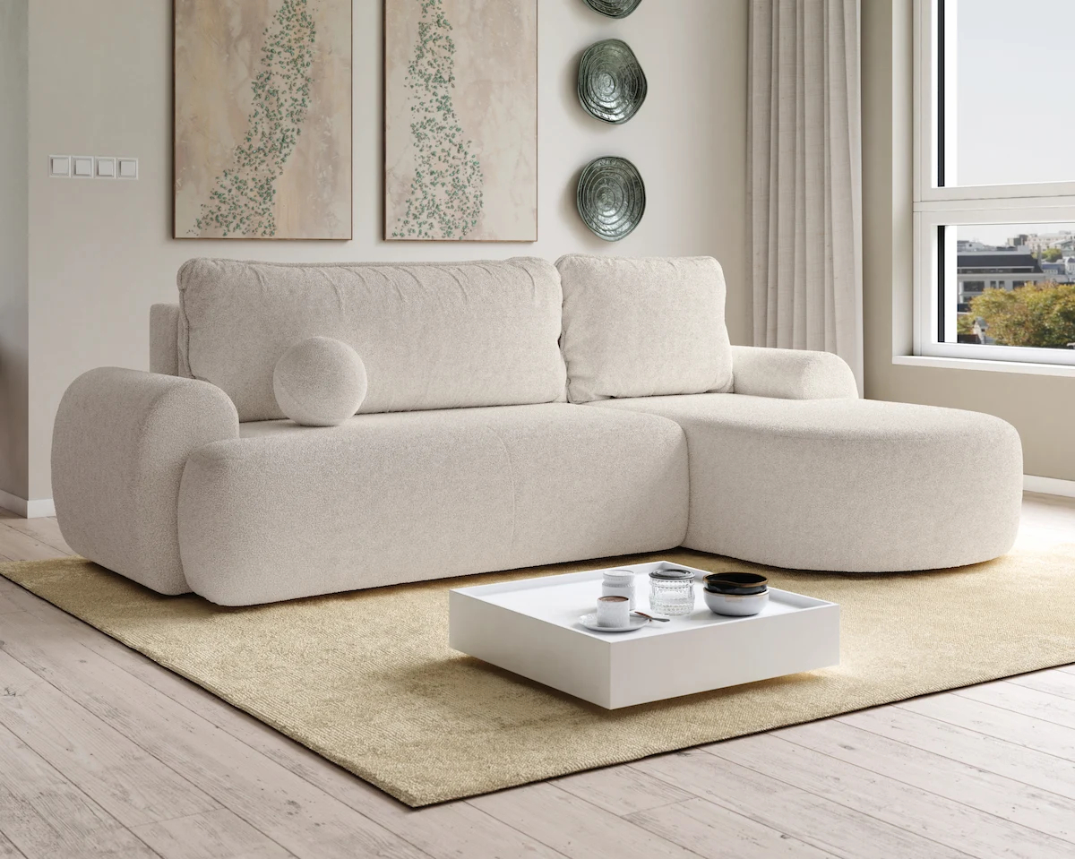 Rohová rozkládací sedačka OVOLI - bouclé - béžová Rohová pohovka OVOLI 260x160 cm s funkcí spaní a úložným prostorem – Bestseller mezi moderními rohovými pohovkami Hledáte rohovou pohovku, která kombinuje moderní design, výjimečné pohodlí a praktická řešení?Rohová pohovka OVOLI 160 x 260 cm s funkcí spaní je perfektní volbou pro ty, kteří si cení stylu a pohodlí. Zaoblený tvar, měkké linie a látka bouclé vytvářejí kus nábytku, který přitahuje pozornost a vybízí k relaxaci. Díky svému harmonickému tvaru se rohová pohovka OVOLI skvěle hodí do různých uspořádání – od minimalistických interiérů, přes Japandi a soft loft, až po klasickou eleganci. Vybavena funkcí spaní a praktickým úložným prostorem na ložní prádlo bude perfektně fungovat nejen jako místo k relaxaci, ale i jako pohodlné lůžko pro hosty. Pro maximální pohodlí je sedák a opěradlo vyrobeno z vlnitých pružin, pružin Bonell a odolné pěny T30, která poskytuje ideální kombinaci pružnosti a odolnosti proti deformaci. Díky tomu rohová pohovka skvěle funguje jak při každodenním používání, tak i jako spací funkce – zaručuje pohodlný spánek a relaxaci. PROVEDENÍ Rozměry: 260 cm x 160 cm - ideální do prostorných obývacích pokojů, Hluboký sedák a široká lehátka - maximální pohodlí odpočinku, Vysoce kvalitní dřevotříska, sololit a dřevěné prvky Látka BOUCLÉ (NOW OR NEVER) - měkká, příjemná na dotek, snadno se udržuje v čistotě, Funkce spaní - rohová pohovka se rychle promění v pohodlnou postel, Kontejner na ložní prádlo - praktický úložný prostor, Sedák a opěradlo na vlnové pružině, bonell pružině a pěně T-30 - elastické, odolné a pohodlné, Možnost volby strany - PRAVÁ / LEVÁ Samostatně stojící rohová pohovka - opěradlo čalouněné látkou Univerzální tvar - možnost nastavení rohové pohovky s levou nebo pravou lehátkou. Polštáře s všitým zipem s možností výměny vložky Polštáře s granulovanou výplní, jejich hloubka a výška závisí na aktuálním uspořádání výplně Rohová pohovka pro svépomocnou montáž - součástí je srozumitelný návod a potřebné příslušenství ROZMĚRY Šířka - 260 cm Hloubka - 160 cm Hloubka sedáku k opěradlu - 80 cm Výška sedáku - 40 cm Plocha na spaní - 140x200 cm Rozměrová tolerance +/- 3 cm AUTOMATICKÝ ASISTENT ROZKLÁDÁNÍ (ZA PŘÍPLATEK) Díky použití mechanismu podporujícího rozkládání je rozložení rohu rychlé a snadné. Je to ideální řešení pro lidi, kteří si cení funkčnosti a pohodlí. BOUCLÉ LÁTKA (NOW OR NEVER) Buklé látka je skutečnou poezií doteku a textury - zauzlovaný tanec příze, který vytváří povrch plný života, hloubky a jemné nedokonalosti. Představte si mlhavé ráno uzavřené v materiálu - každý zákrut a smyčka je jako kapka rosy, která ještě nestihla spadnout z pavučiny. Buklé není jen látka - je to příběh vyprávěný šeptem, ve kterém se jemnost a smyslnost prolíná se syrovou povahou vlákna. Každá barva, od tlumené krémové, přes tlumenou olivovou, pudrově růžovou, až po majestátní černou, vypráví jiný příběh.
