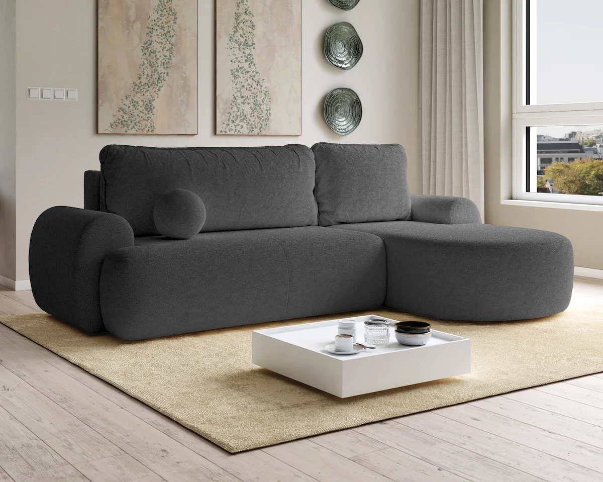 Rohová rozkládací sedačka OVOLI - bouclé - grafitová Rohová pohovka OVOLI 260x160 cm s funkcí spaní a úložným prostorem – Bestseller mezi moderními rohovými pohovkami Hledáte rohovou pohovku, která kombinuje moderní design, výjimečné pohodlí a praktická řešení?Rohová pohovka OVOLI 160 x 260 cm s funkcí spaní je perfektní volbou pro ty, kteří si cení stylu a pohodlí. Zaoblený tvar, měkké linie a látka bouclé vytvářejí kus nábytku, který přitahuje pozornost a vybízí k relaxaci. Díky svému harmonickému tvaru se rohová pohovka OVOLI skvěle hodí do různých uspořádání – od minimalistických interiérů, přes Japandi a soft loft, až po klasickou eleganci. Vybavena funkcí spaní a praktickým úložným prostorem na ložní prádlo bude perfektně fungovat nejen jako místo k relaxaci, ale i jako pohodlné lůžko pro hosty. Pro maximální pohodlí je sedák a opěradlo vyrobeno z vlnitých pružin, pružin Bonell a odolné pěny T30, která poskytuje ideální kombinaci pružnosti a odolnosti proti deformaci. Díky tomu rohová pohovka skvěle funguje jak při každodenním používání, tak i jako spací funkce – zaručuje pohodlný spánek a relaxaci. PROVEDENÍ Rozměry: 260 cm x 160 cm - ideální do prostorných obývacích pokojů, Hluboký sedák a široká lehátka - maximální pohodlí odpočinku, Vysoce kvalitní dřevotříska, sololit a dřevěné prvky Látka BOUCLÉ (NOW OR NEVER) - měkká, příjemná na dotek, snadno se udržuje v čistotě, Funkce spaní - rohová pohovka se rychle promění v pohodlnou postel, Kontejner na ložní prádlo - praktický úložný prostor, Sedák a opěradlo na vlnové pružině, bonell pružině a pěně T-30 - elastické, odolné a pohodlné, Možnost volby strany - PRAVÁ / LEVÁ Samostatně stojící rohová pohovka - opěradlo čalouněné látkou Univerzální tvar - možnost nastavení rohové pohovky s levou nebo pravou lehátkou. Polštáře s všitým zipem s možností výměny vložky Polštáře s granulovanou výplní, jejich hloubka a výška závisí na aktuálním uspořádání výplně Rohová pohovka pro svépomocnou montáž - součástí je srozumitelný návod a potřebné příslušenství ROZMĚRY Šířka - 260 cm Hloubka - 160 cm Hloubka sedáku k opěradlu - 80 cm Výška sedáku - 40 cm Plocha na spaní - 140x200 cm Rozměrová tolerance +/- 3 cm AUTOMATICKÝ ASISTENT ROZKLÁDÁNÍ (ZA PŘÍPLATEK) Díky použití mechanismu podporujícího rozkládání je rozložení rohu rychlé a snadné. Je to ideální řešení pro lidi, kteří si cení funkčnosti a pohodlí. BOUCLÉ LÁTKA (NOW OR NEVER) Buklé látka je skutečnou poezií doteku a textury - zauzlovaný tanec příze, který vytváří povrch plný života, hloubky a jemné nedokonalosti. Představte si mlhavé ráno uzavřené v materiálu - každý zákrut a smyčka je jako kapka rosy, která ještě nestihla spadnout z pavučiny. Buklé není jen látka - je to příběh vyprávěný šeptem, ve kterém se jemnost a smyslnost prolíná se syrovou povahou vlákna. Každá barva, od tlumené krémové, přes tlumenou olivovou, pudrově růžovou, až po majestátní černou, vypráví jiný příběh.