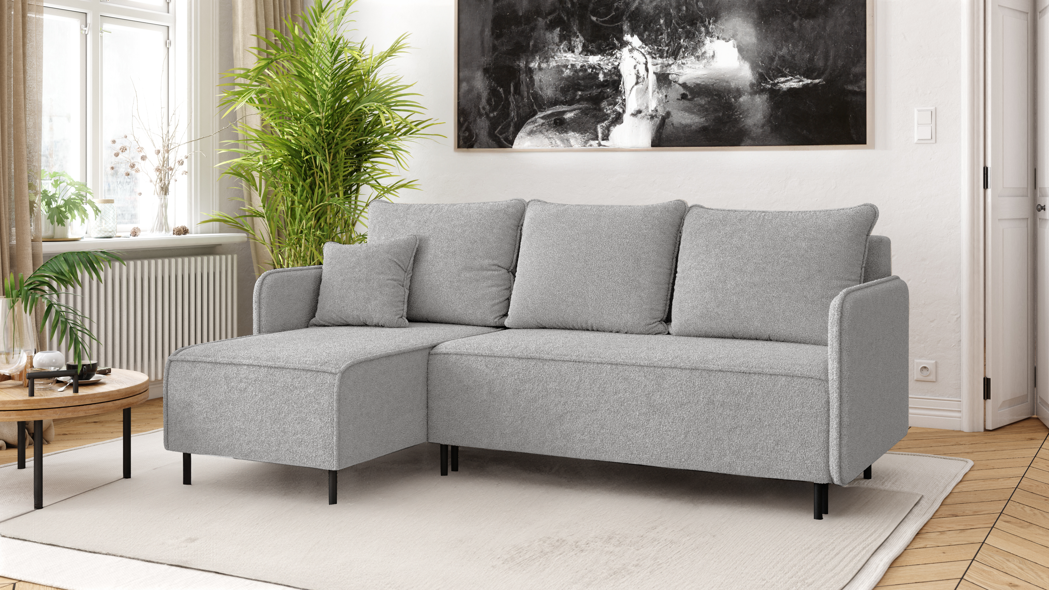 Rozkládací rohová sedačka FLUFFY - Bonellové pružiny a pevná čalounická pěna T-28 - úložný prostor - plocha na spaní 140x200 cm - velice měkká boucle látka