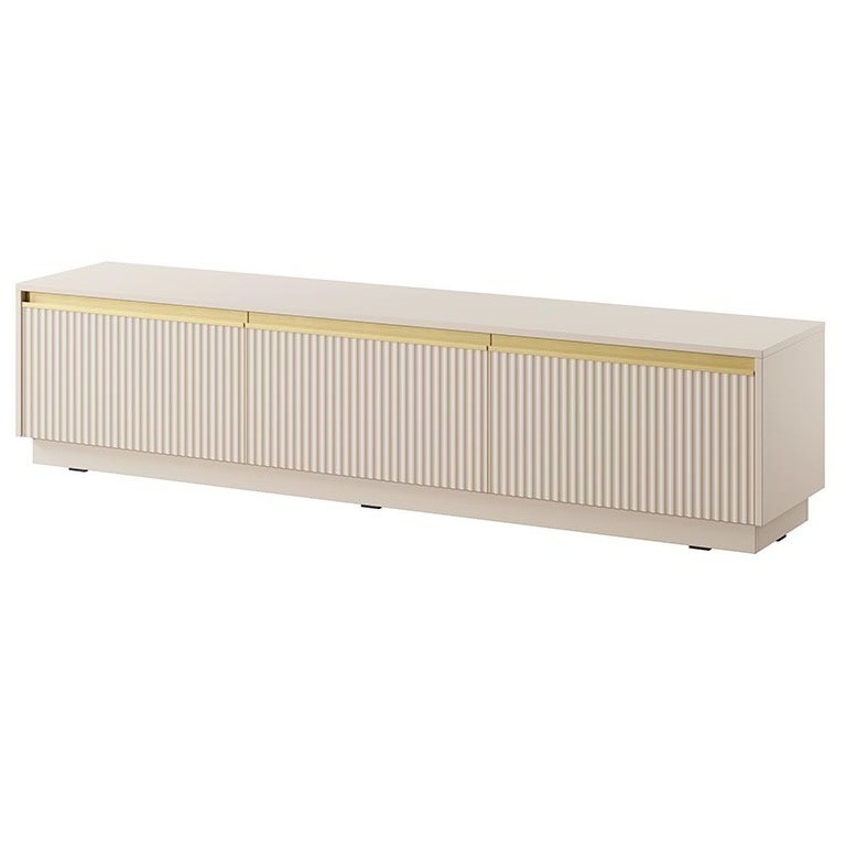 Nábytková sestava ROYAL – Elegance a moderní design pro váš domov Objevte nábytkovou sestavu ROYAL, která přináší do vašeho interiéru kombinaci elegance a moderního designu. Tato unikátní kolekce je charakteristická svým rýhovaným dekorem na čelních plochách, který dodává nábytku sofistikovaný vzhled a zajímavou texturu. Zlaté horizontální úchyty diskrétně doplňují celkový design a podtrhují jeho exkluzivitu. Sestava ROYAL je navržena tak, aby dokonale ladila s různými styly bydlení a stala se dominantou každého obývacího pokoje. Dostupnost a variabilita Nábytková sestava ROYAL je dostupná ve třech elegantních barevných variantách: nadčasové bílé elegantní černé jemné béžové. Díky této široké škále barev si můžete vybrat tu, která nejlépe doplní váš stávající interiér a osobní styl. Ať už preferujete světlé a vzdušné prostory, nebo dáváte přednost výraznějším tónům, ROYAL vám umožní vytvořit harmonický a funkční domov. Sestava nabízí dostatek úložného prostoru a promyšlené řešení pro moderní bydlení. PROVEDENÍ Vysoce kvalitní laminovaná dřevotřísková deska Hrany dodatečně zakončené ABS dýhou MDF deska Pevné a stabilní kovové nožky Bezúchytkový systém otevírání Odolná a pevná konstrukce Nábytek pro svépomocnou montáž, dodáván v rozloženém stavu s návodem ROZMĚRY Šířka - 180 cm Výška - 42 cm Hloubka - 39 cm Rozměrová tolerance +/- 3 cm.
