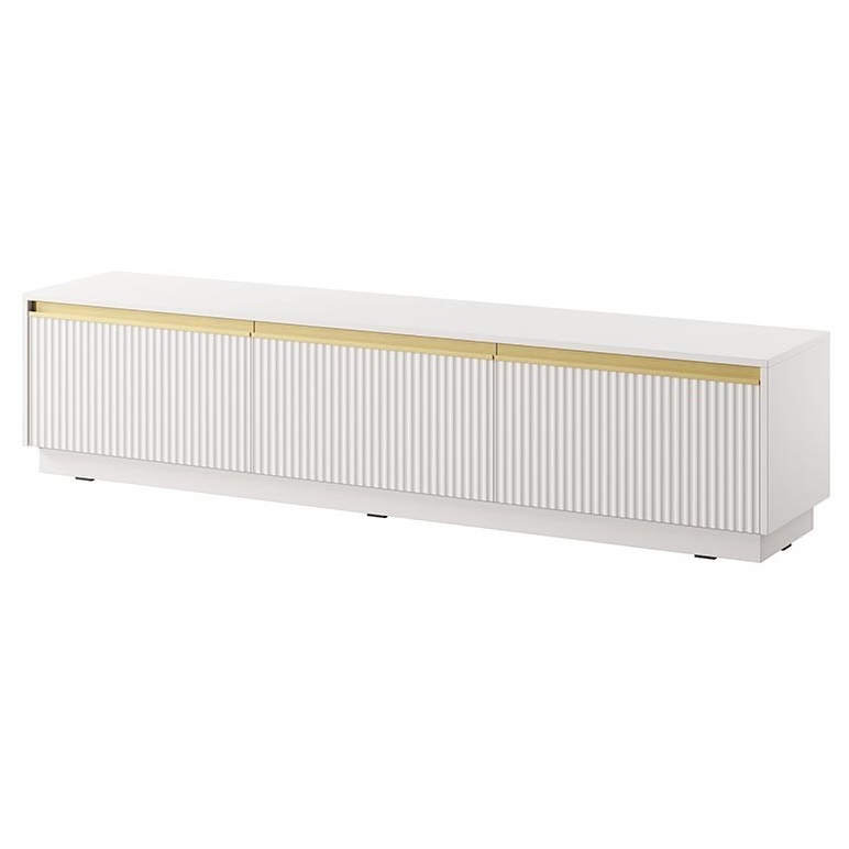 Nábytková sestava ROYAL – Elegance a moderní design pro váš domov Objevte nábytkovou sestavu ROYAL, která přináší do vašeho interiéru kombinaci elegance a moderního designu. Tato unikátní kolekce je charakteristická svým rýhovaným dekorem na čelních plochách, který dodává nábytku sofistikovaný vzhled a zajímavou texturu. Zlaté horizontální úchyty diskrétně doplňují celkový design a podtrhují jeho exkluzivitu. Sestava ROYAL je navržena tak, aby dokonale ladila s různými styly bydlení a stala se dominantou každého obývacího pokoje. Dostupnost a variabilita Nábytková sestava ROYAL je dostupná ve třech elegantních barevných variantách: nadčasové bílé elegantní černé jemné béžové. Díky této široké škále barev si můžete vybrat tu, která nejlépe doplní váš stávající interiér a osobní styl. Ať už preferujete světlé a vzdušné prostory, nebo dáváte přednost výraznějším tónům, ROYAL vám umožní vytvořit harmonický a funkční domov. Sestava nabízí dostatek úložného prostoru a promyšlené řešení pro moderní bydlení. PROVEDENÍ Vysoce kvalitní laminovaná dřevotřísková deska Hrany dodatečně zakončené ABS dýhou MDF deska Pevné a stabilní kovové nožky Bezúchytkový systém otevírání Odolná a pevná konstrukce Nábytek pro svépomocnou montáž, dodáván v rozloženém stavu s návodem ROZMĚRY Šířka - 180 cm Výška - 42 cm Hloubka - 39 cm Rozměrová tolerance +/- 3 cm.