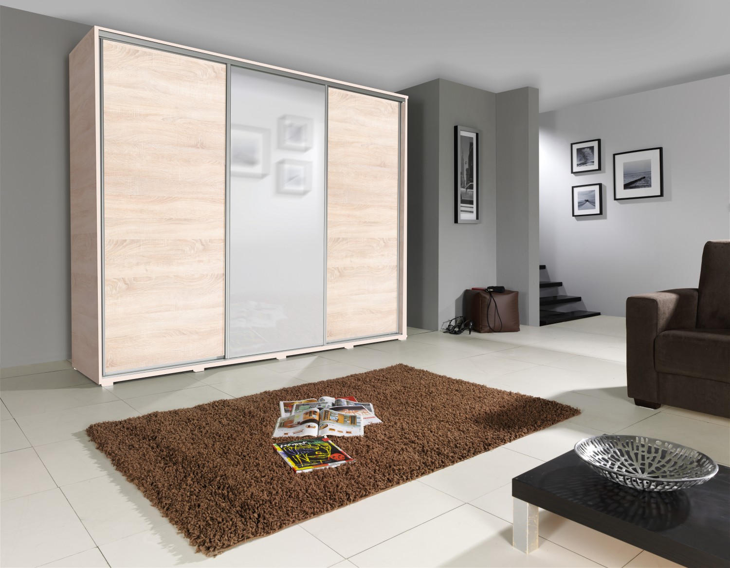 Rozměry: výška 215 cm šířka 255 cm hloubka 66 cm Barva: dub sonoma / zrcadlo SILVER skříň je ideálním řešením pro zákazníky, kteří oceňují funkčnost a vysokou kvalitu. Moderní barvy, velké zrcadlo a praktický způsob uspořádání interiéru skříně uspokojí téměř každého.Nábytek je vyroben z laminované desky, hrany jsou zajištěny ABS hranou. Skříň používá hliníková očka SEVROLL. Police uvnitř s hliníkovým profilem. Tloušťka korpusu je 22 mm, čela - 16 mm. Hliníkové boční profily. Plastové nohy.