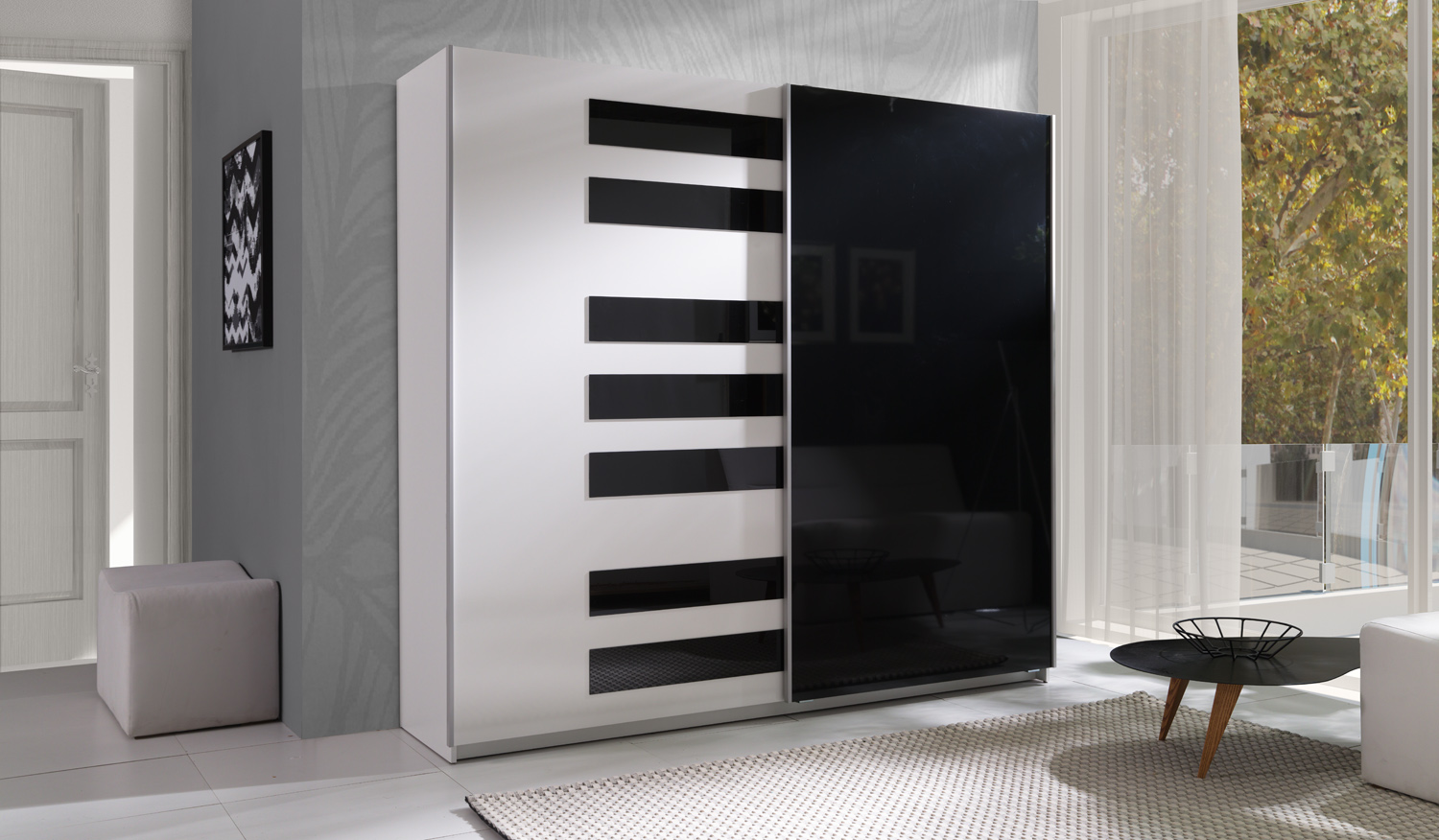 Rozměry: výška 211 cm šířka 225 cm hloubka 63 cm Barva: bílý lesk / černý lesk Šatní skříně Twister jsou ideální do obývacího pokoje, pokoje pro mládež i do ložnice. Nábytek je vyroben z laminované desky, hrany jsou zajištěny ABS hranou. Ve skříních se používají hliníková vodítka Hettich. Hliníkové boční profily. Tloušťka korpusu a čel je 16 mm.