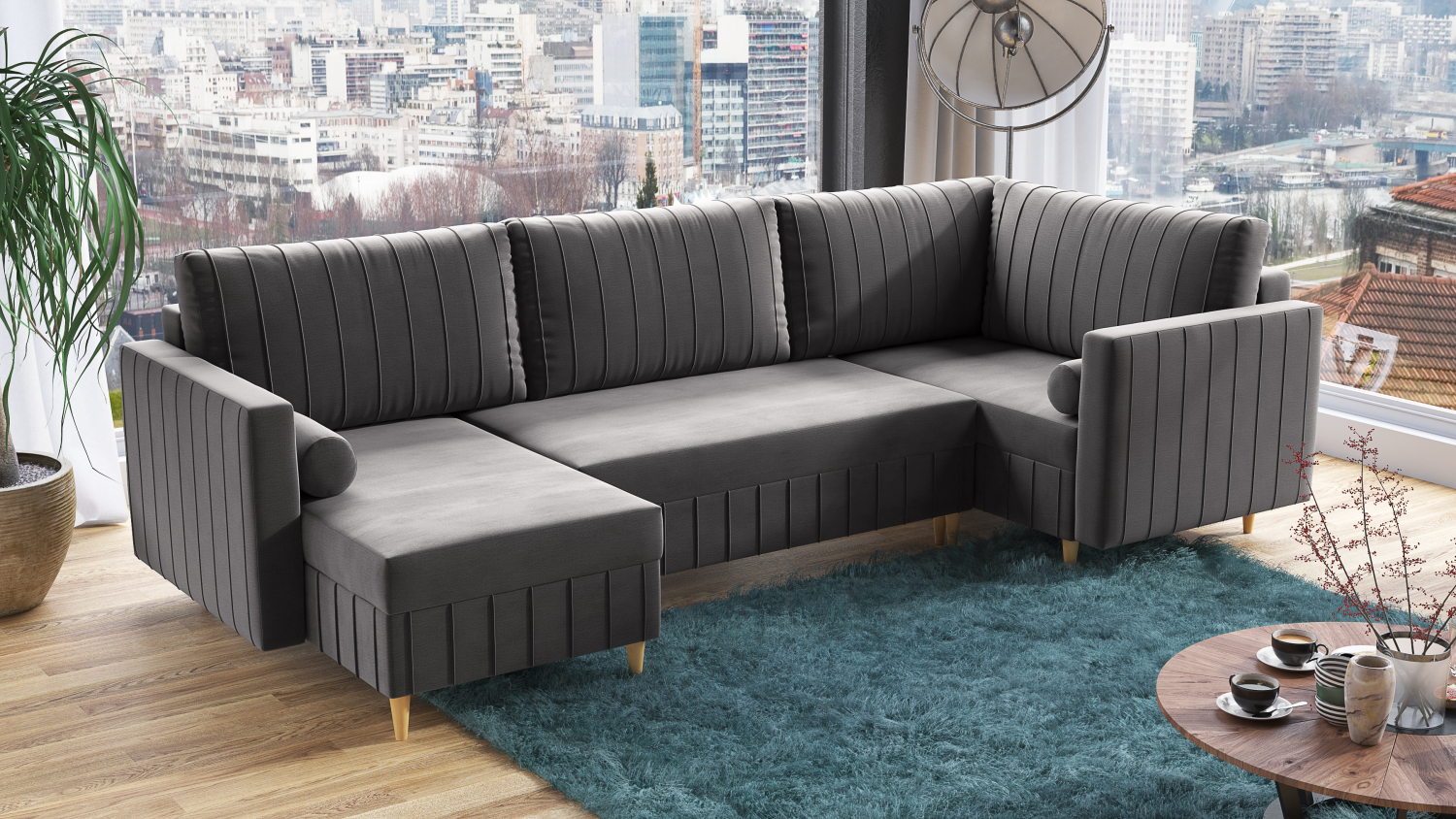 ROZMĚRY: Šířka: 295 cm Hloubka: 145 cm Hloubka sedu: 80 cm Výška sedu: 46 cm Výška: 95 cm Plocha na spaní - 150x270 cm