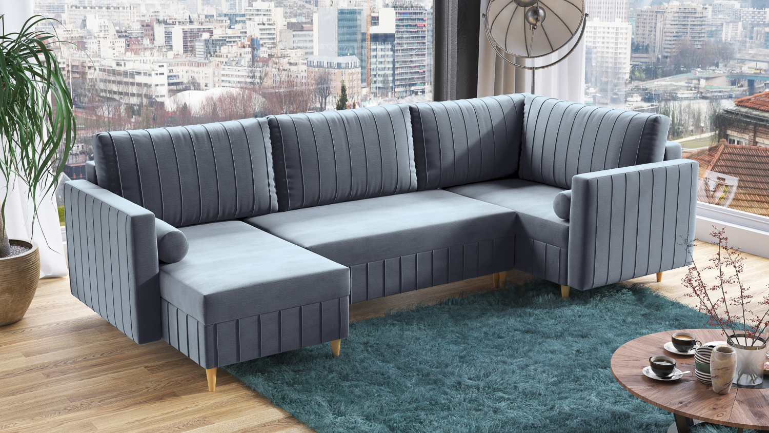 ROZMĚRY: Šířka: 295 cm Hloubka: 145 cm Hloubka sedu: 80 cm Výška sedu: 46 cm Výška: 95 cm Plocha na spaní - 150x270 cm