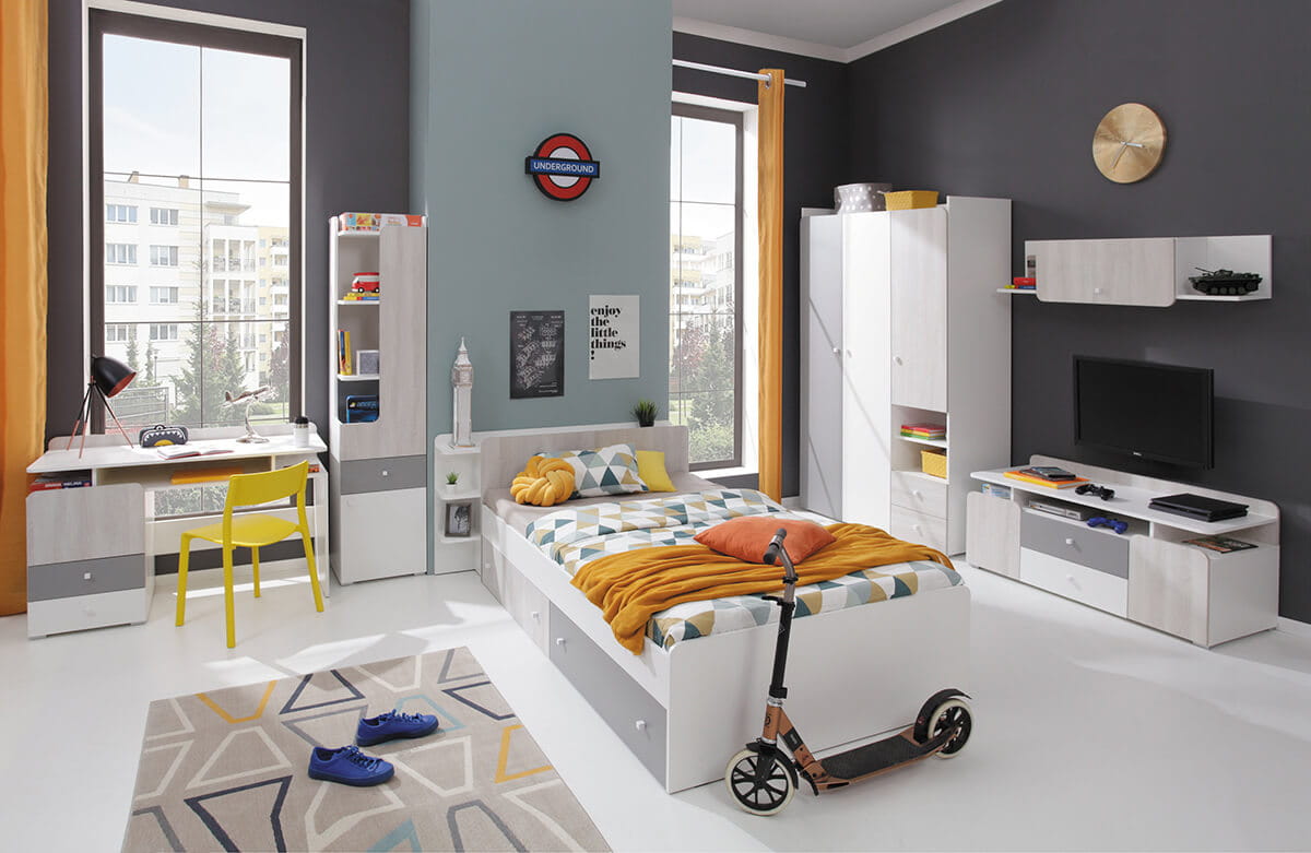 Sestava se skláda z (š/v/h) cm: Psací stůl COMO CM09 - 125/86/55 RegálCOMO CM05 - 45/190/40 Postel COMO CM12 - 224/80/114 - spací plocha 90x200 cm Šatní skříň COMO CM01 - 120/190/50 Televizní stolek COMO CM08 - 120/58/50 Police COMO CM10 - 120/28/25