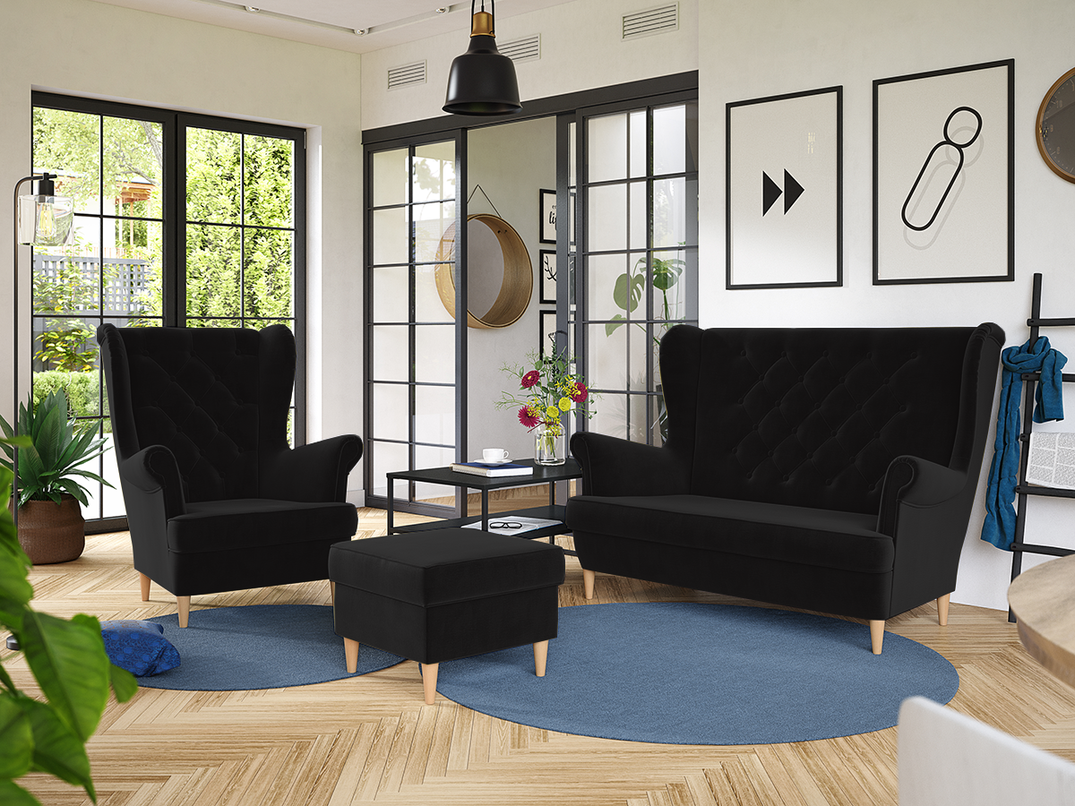 ROZMĚRY: Šířka křesla: 83 cm Výška sedáku: 40 cm Hloubka sedáku: 60 cm Šířka taburetu: 51 cm Hloubka taburetu: 51 cm Šířka pohovky: 140 cm Hloubka sedáku: 60 cm Výška pohovky: 102 cm