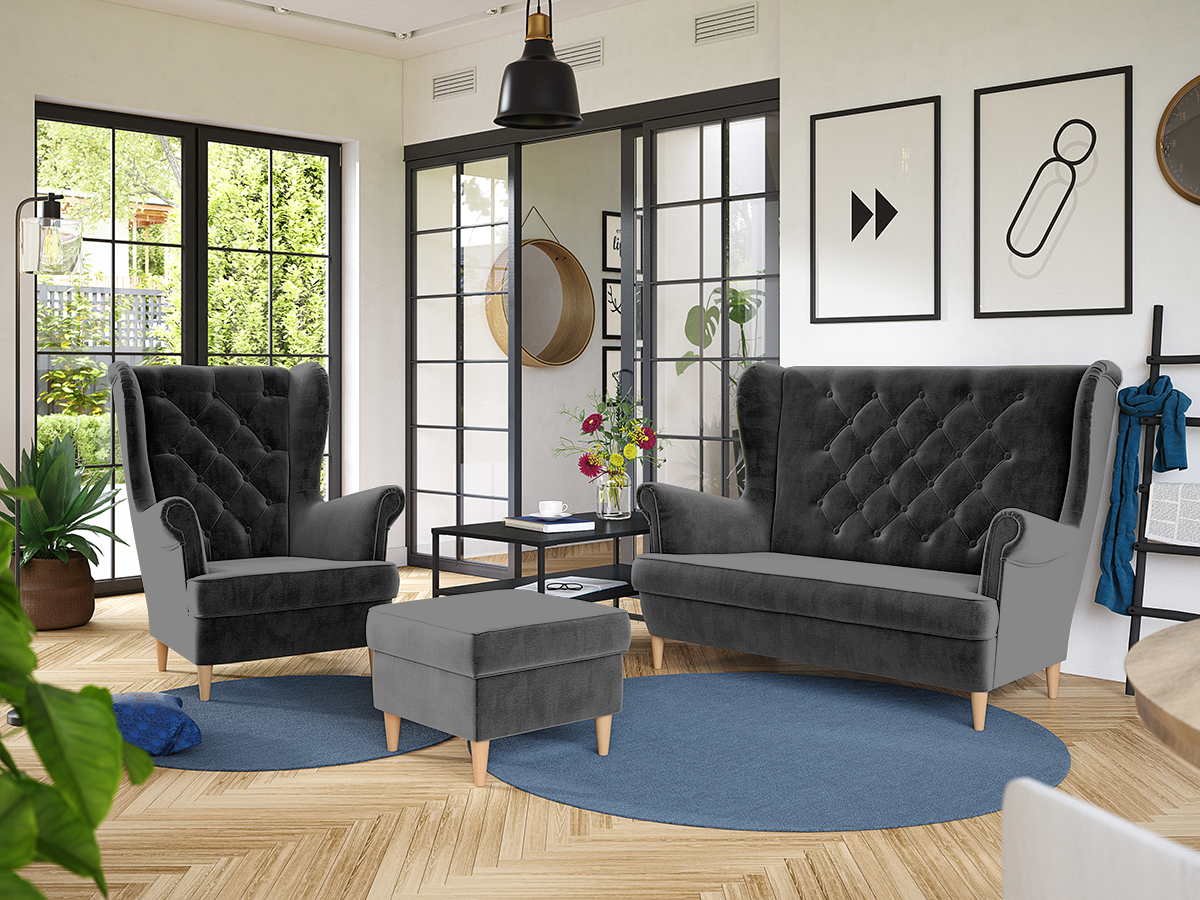 ROZMĚRY: Šířka křesla: 83 cm Výška sedáku: 40 cm Hloubka sedáku: 60 cm Šířka taburetu: 51 cm Hloubka taburetu: 51 cm Šířka pohovky: 140 cm Hloubka sedáku: 60 cm Výška pohovky: 102 cm