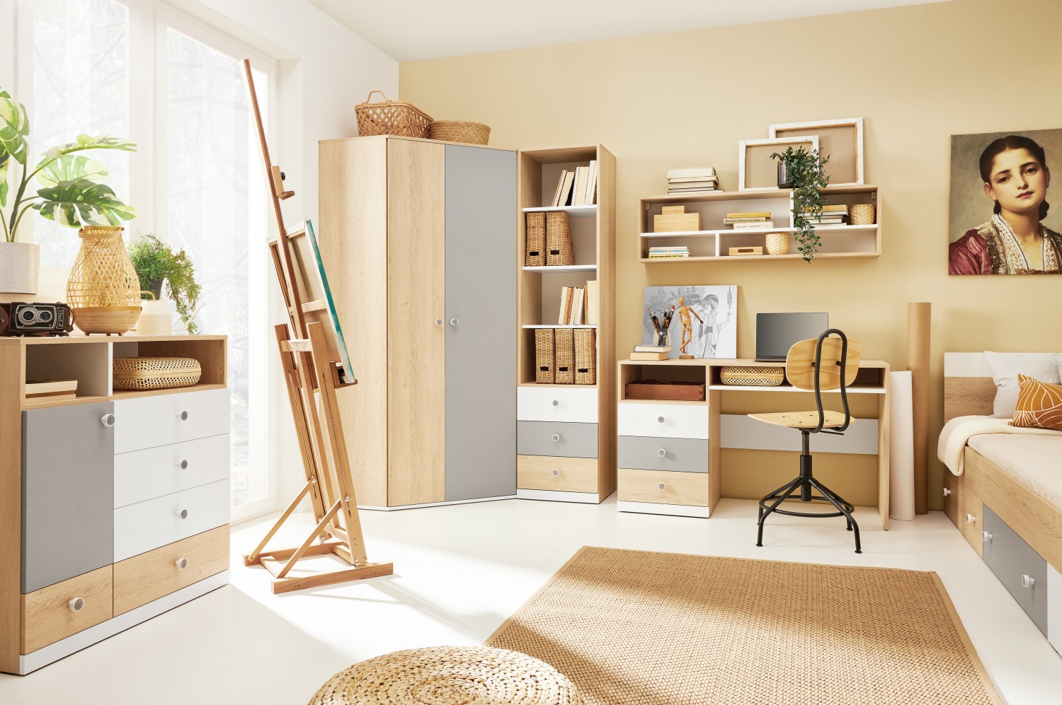 Sestava se skláda (šířka / výška / hloubka ) cm: Komoda PIXEL PX09 - 85/90/40 Rohová šatní skříň PIXEL PX02 - 90/190/90 Regál PIXEL PX06 - 45/190/40 Psací stůl PIXEL PX08 - 125/76/55 Police PIXEL PX12 - 125/35/22