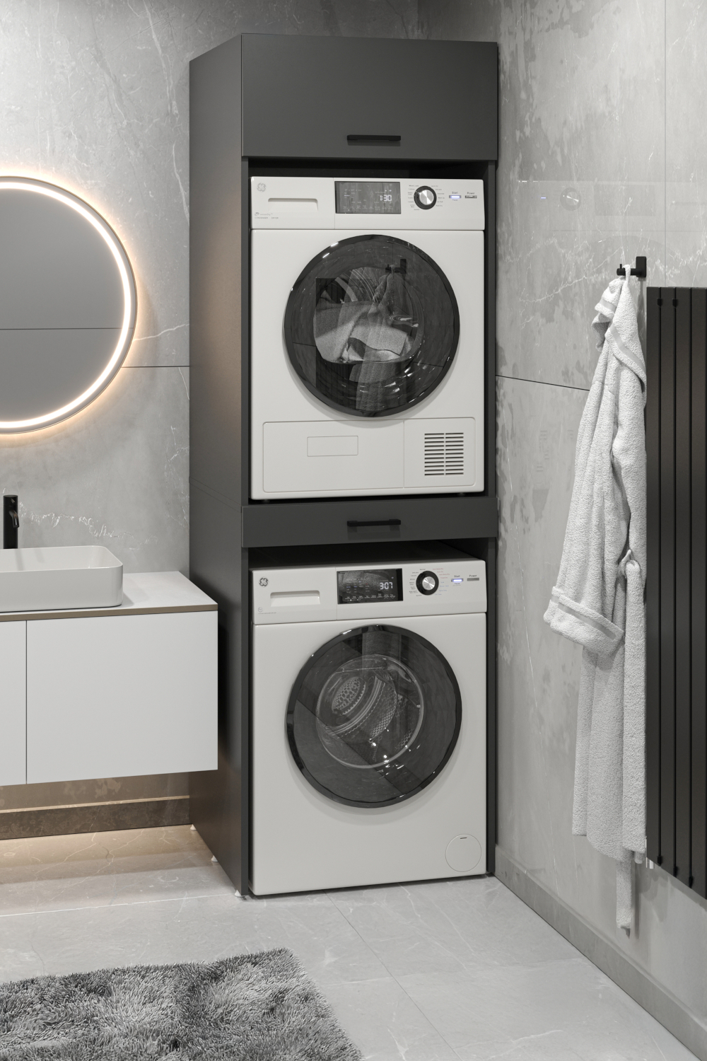 Skříňka pro pračku a sušičku SLAV - antracit Řešíte nedostatek místa v koupelně? Skříňka na pračku a sušičku SLAV je skvělým řešením, jak využít prostor na maximum. Díky tomuto praktickému nábytku můžete spotřebiče umístit nad sebe, a získat tak cenné místo pro další koupelnové nezbytnosti. Skříňka je navíc vybavena výsuvnou policí, která se hodí k třídění prádla, nebo pro odložení koše na prádlo. Nad sušičkou pak najdete uzavřenou skříňku, do které si můžete schovat ručníky, čisticí prostředky nebo jiné doplňky. Tento funkční kousek je dostupný ve třech barevných variantách – v elegantní bílé, moderním antracitu, nebo v dekoru dub safír, který do interiéru vnese teplo a přírodní nádech. Se skříňkou SLAV bude vaše koupelna uklizená a organizovaná. PROVEDENÍ Police z laminované dřevotřísky dodáváno v rozloženém stavu regál je vyroben z 18mm dřevotřískové desky v souladu s 1. třídou evropských norem kvality E1 snadné sestavení do několika minut veškeré komponenty k sestavení i přehledný návod v balení ROZMĚRY Šířka - 67 cm Hloubka - 68,8 cm Výška - 215,4 cm Rozměrová tolerance +/- 3 cm.