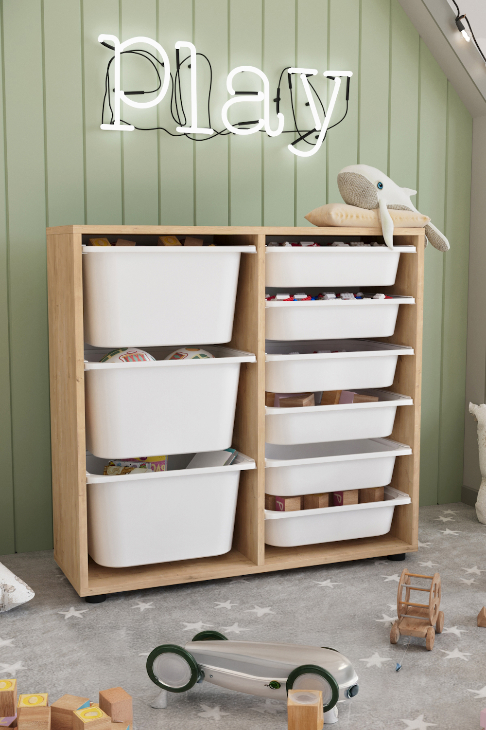 Praktické a stylové řešení pro dětský pokoj Úložný box ADELA je ideálním řešením pro udržení pořádku v dětském pokoji. Díky kombinaci tří velkých a šesti menších úložných boxů nabízí dostatek místa pro hračky, stavebnice, knížky i oblečení. Díky své výšce je nábytek bezpečný a snadno dostupný i pro malé děti, které se tak mohou samy podílet na úklidu a učit se zodpovědnosti. Boxy jsou vyjímatelné, což usnadňuje přenášení hraček a čištění. Stylové provedení se navíc skvěle hodí do každého moderního interiéru. Flexibilní design a kvalitní materiály Úložný box ADELA je navržen tak, aby se přizpůsobil vašim potřebám. Je k dispozici ve třech barevných variantách: elegantní bílé, přírodním dubu safíru a moderním antracitu, takže si snadno vyberete provedení, které nejlépe doplní váš interiér. Stabilní konstrukce z kvalitního lamina a odolné plastové boxy zaručují dlouhou životnost. Se svými kompaktními rozměry se úložný box vejde i do menších prostor, přičemž stále poskytuje velký objem pro ukládání. PROVEDENÍ Materiál: laminovaná dřevotříska + plastové koše dodáváno v rozloženém stavu regál je vyroben z 18mm dřevotřískové desky v souladu s 1. třídou evropských norem kvality E1 snadné sestavení do několika minut přehledný návod v balení ROZMĚRY Šířka - 88,7 cm Výška - 85,5 cm Hloubka - 30 cm Menší plastový koš - 9,5 x 40,3 x 30 cm Větší plastový koš - 22,6 x 40,3 x 30 cm Rozměrová tolerance +/- 3 cm.