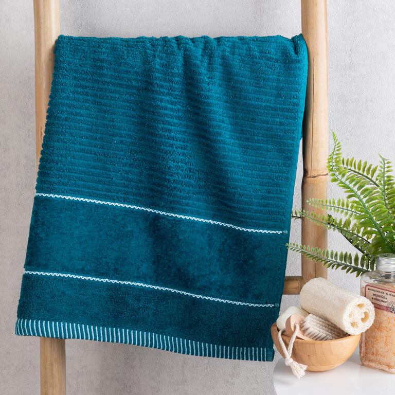 Bavlněná osuška z kolekce TEO v atraktivním temně tyrkysovém odstínu se střiženou bordurou z oblíbeného smyčkového froté je velmi příjemná na omak a ohleduplná k vaší pokožce. Vysoká gramáž dodává osušce výjimečnou měkkost a dlouhodobou životnost. Vyznačuje se výbornou savostí a antistatickými vlastnostmi. Certifikáty Öko-Tex Standard 100 A Öko-Tex Made in Green zaručují nulový obsah škodlivých látek i zdravé pracovní procesy při výrobě.