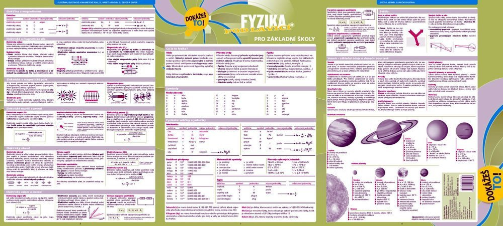 Leporelo s šesti listy plnými souhrnných informací z matematiky, chemie a fyziky pro druhý stupeň základní školy a pro školy střední.Přehledně, stručně a jasně shrnuje nejdůležitější učivo všech ročníků od šesté do deváté třídy. Všechny jevy jsou demonstrovány pomocí definic, zákonů, vzorových příkladů, zobrazení, vzorců, názorných rovnic a výpočtů a opatřeny řadou grafů, přehledových seznamů a komplexních tabulek.S přehlednou grafikou a úpravou této učební pomůcky budou mít žáci celistvý přehled o učivu základní školy vždy při ruce.Atraktivní šestistránková laminovaná, omyvatelná skládačka s otvory pro zavěšení do pořadačů se může stát praktickou pomůckou pro každodenní kontakt se základními přírodovědnými předměty.